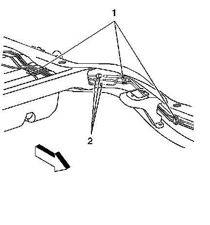 7. Disconnect the rear fuel and evaporative emissions (EVAP) pipes (2) at the chassis fuel and EVAP pipes. Refer to Plastic Collar Quick Connect Fitting Service Procedures.
