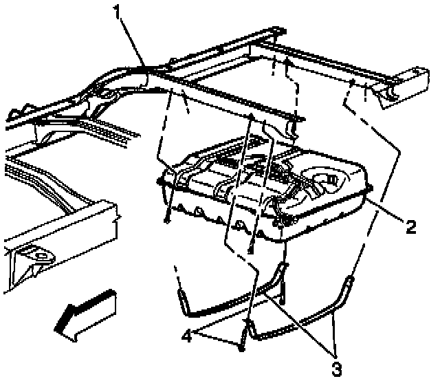 9. Install the new attaching bolts (4) to the fuel tank straps and tighten the bolts to 20.5 Nm (15 lb ft).