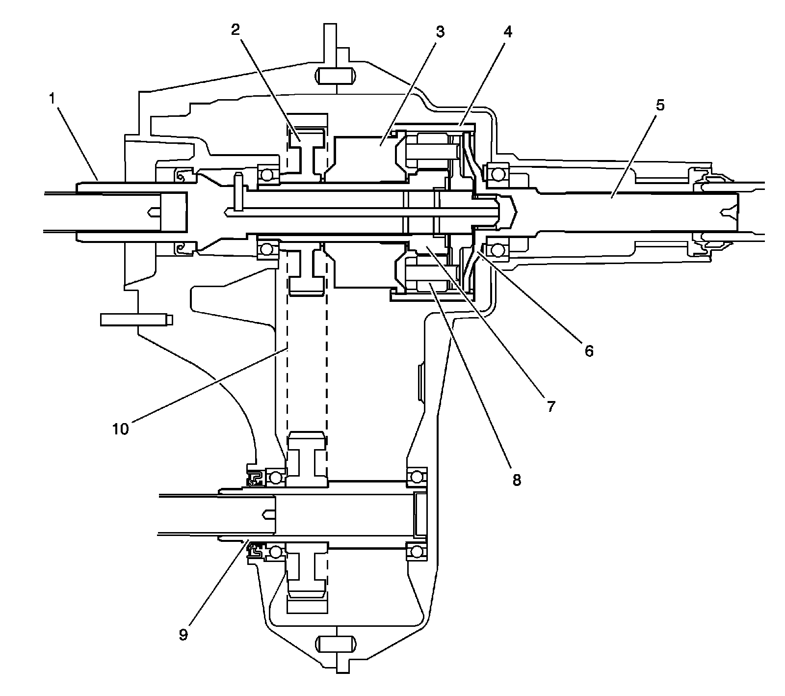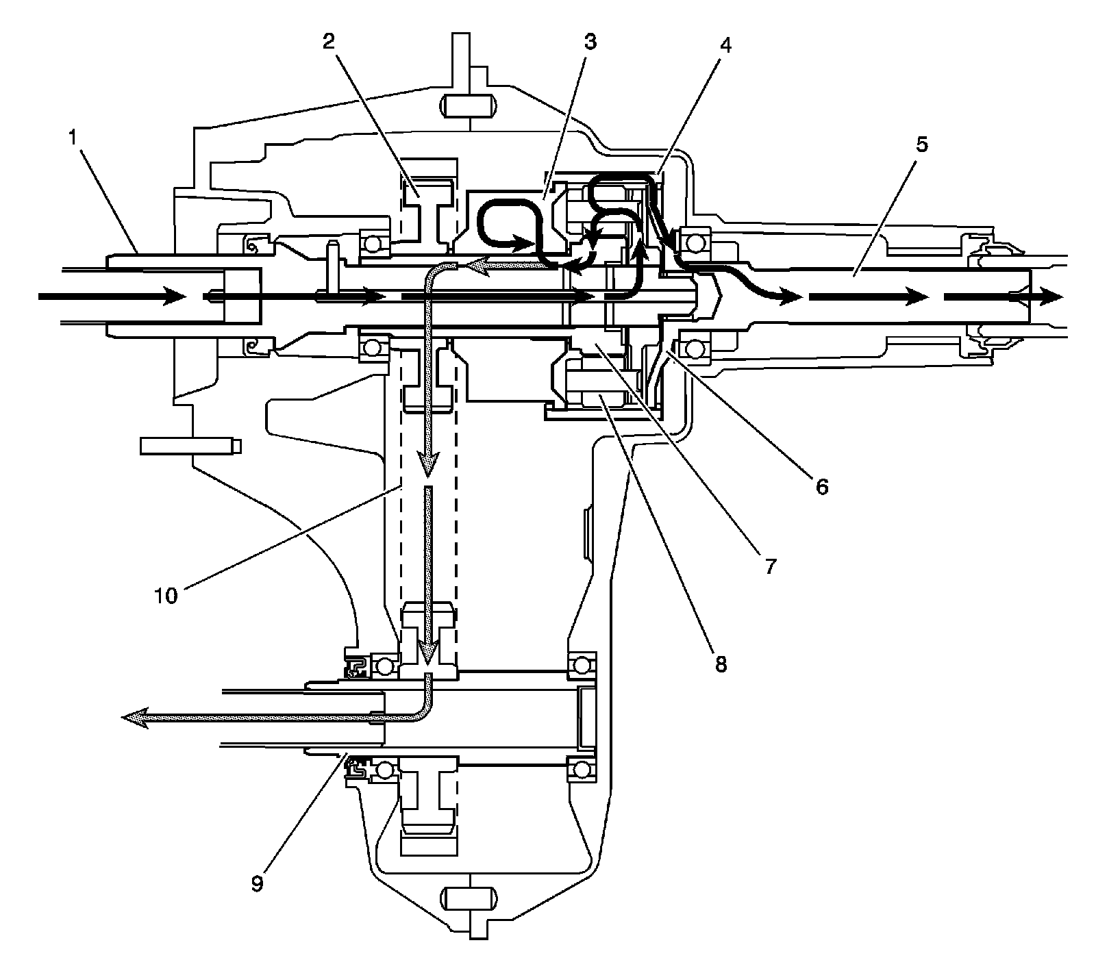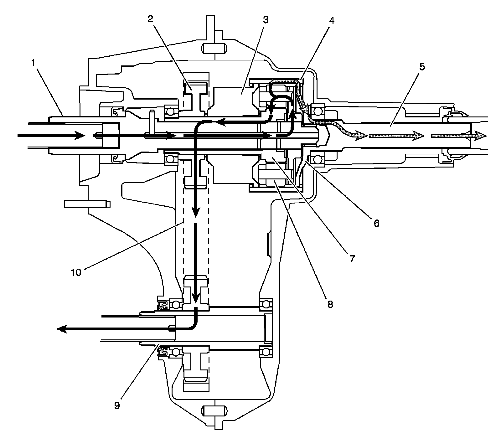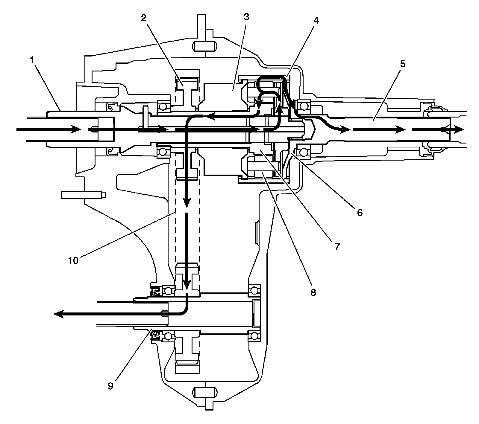During normal operation, 100 percent engine torque is delivered to the input shaft (1) from the transmission. The torque is split 65 percent to the rear output shaft (5), and 35 percent to the front output shaft (9), by the planetary differential (4). Because there is not a loss in traction, or slip in the front or rear wheels, the viscous coupling (3) is locked in place and there is no shear mode or hump mode involved.