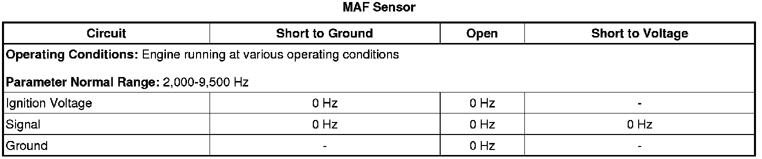 The ECM applies 5 V to the MAF sensor on the MAF sensor signal circuit. The sensor uses the voltage to produce a frequency based on the inlet air flow through the sensor bore. The frequency varies within a range of near 2,000 Hertz at idle to near 9,500 Hertz at maximum engine load.