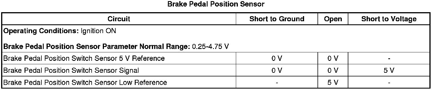 The BPP sensor is a three wire sensor, connected to a 5 V reference circuit, a low reference circuit, and a signal circuit. The ECM supplies 5 V to the BPP sensor, and also provides a sensor ground path on the low reference circuit. The BPP sensor sends a voltage signal to the ECM on the signal circuit. The voltage on the signal circuit will vary from a voltage greater than 0.25 V when the brake pedal is released to a voltage less than 4.75 V when the brake pedal is fully applied.