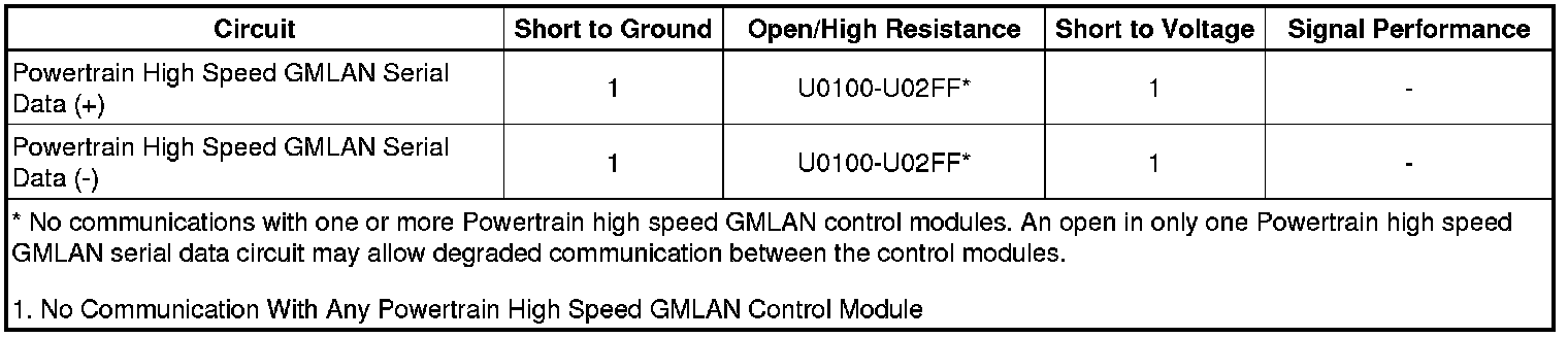 * A short to ground on the Powertrain high speed GMLAN serial data circuit between a control module and a terminating resistor.
