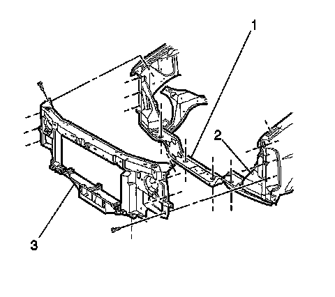 The lower tie bar (1) is serviced as a separate assembly and includes the radiator support body mount reinforcements. It is replaced at the factory seams and is plug welded to the front fender braces (2). The lower tie-bar is bolted through the body mounts and onto the frame. The body mount bolts are torqued to 85 N �m (63 lb ft).