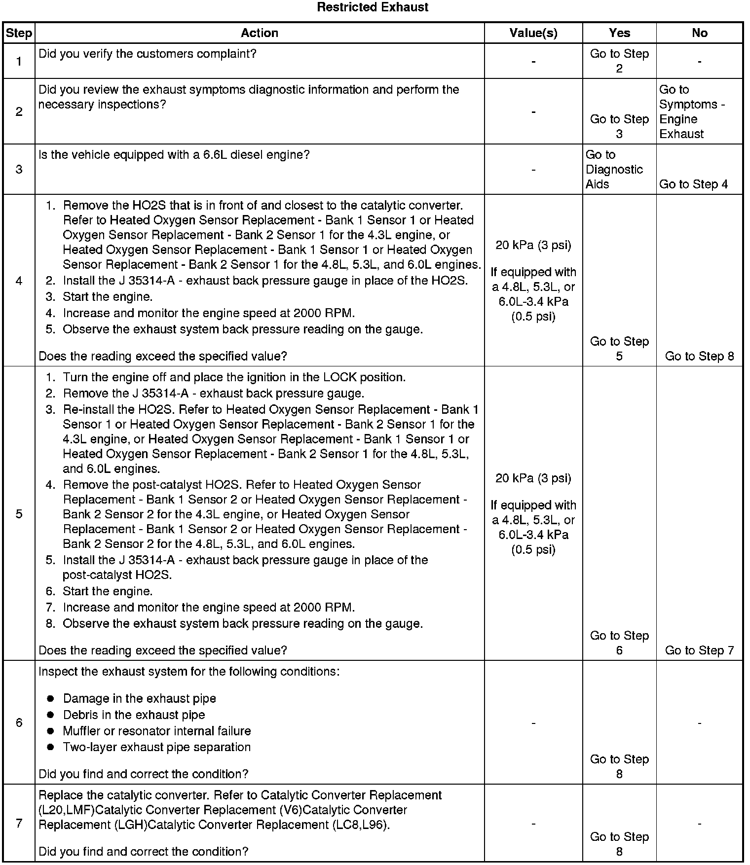 If the vehicle is equipped with a 6.6L diesel engine do not perform this diagnostic. The exhaust system does not have a location for installing the J 35314-A - exhaust back pressure gauge. Instead remove the suspect component, operate the vehicle, verify for improved performance. If performance is improved then replace the faulty component.