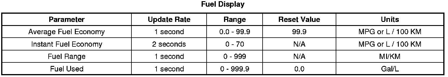 The engine control module (ECM) sends the average fuel economy serial data message to the instrument panel cluster (IPC). The value of this mode is retained during ignition OFF and can be changed between English units and metric units by selecting from the driver information center (DIC) options menu.