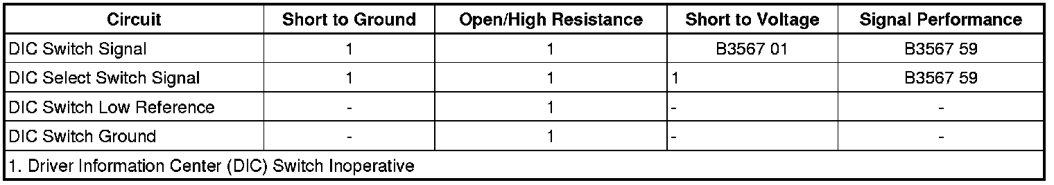The driver information switches are normally open momentary switches. Power is provided to the driver information center (DIC) switches via the instrument panel cluster (IPC). The IPC interfaces with the DIC switches via 3 discreet circuits. The switch input to the cluster is pulled low or grounded when a switch is activated. The IPC reads the voltage at the analog input to determine which switch(es) is pressed. The switch input to the cluster is set up in a resistor ladder format for three of the four switches. The DIC switches include the PERSONALIZATION, SET/RESET, TRIP/FUEL, AND VEHICLE INFO switches. A stuck switch or a short to battery sets a DTC.