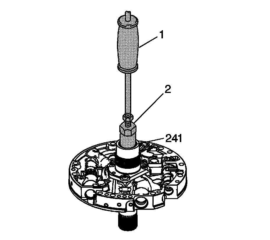4. Using the J 25019-14 - bushing installer (2) with the J 7004-A - remover (1), remove the stator shaft rear bushing (241).