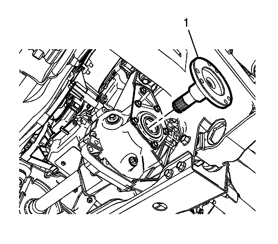 6. Carefully guide the front drive axle inner shaft (1) past the inner shaft seal until the retaining ring contacts the differential case side gear.