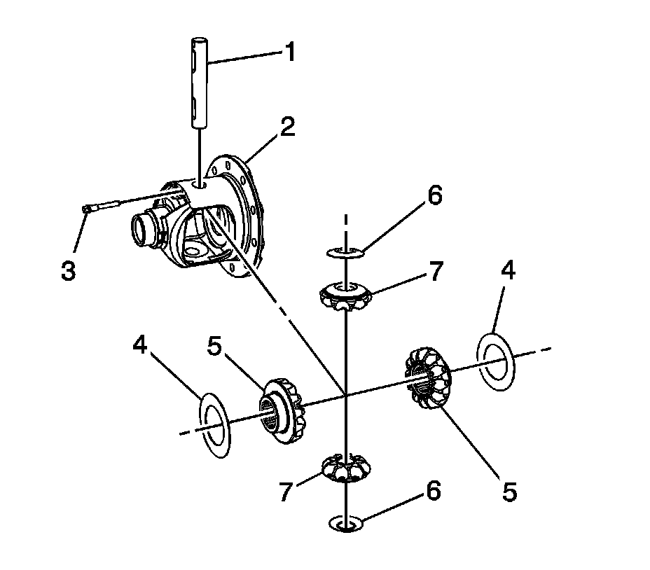 6. Rotate the differential side gears (5) until the pinion gears (7) are directly opposite the opening in the differential case (2).