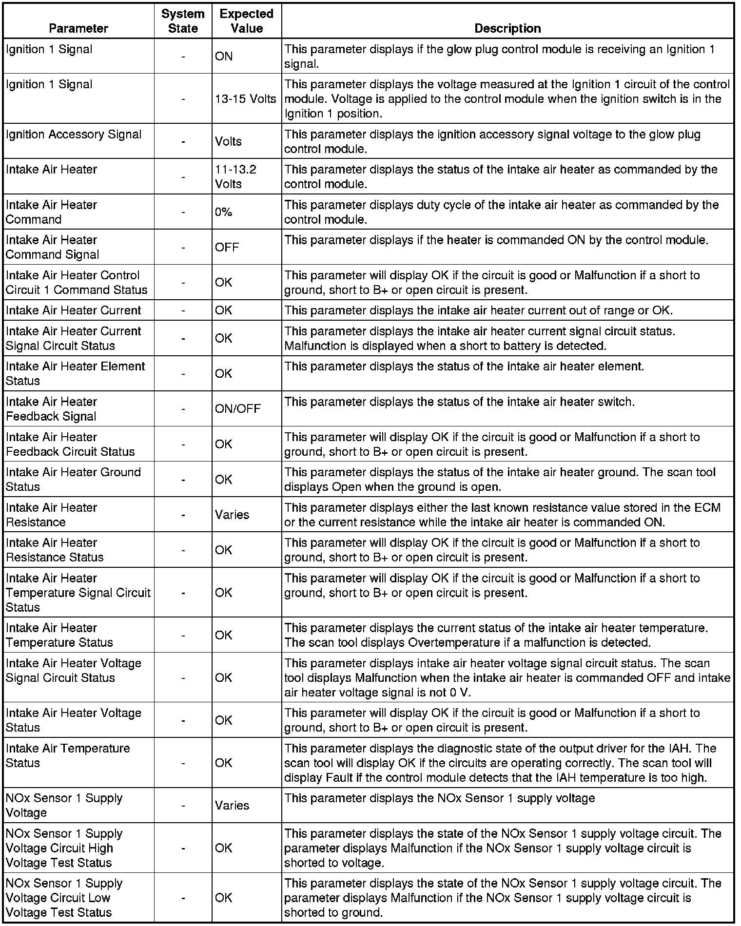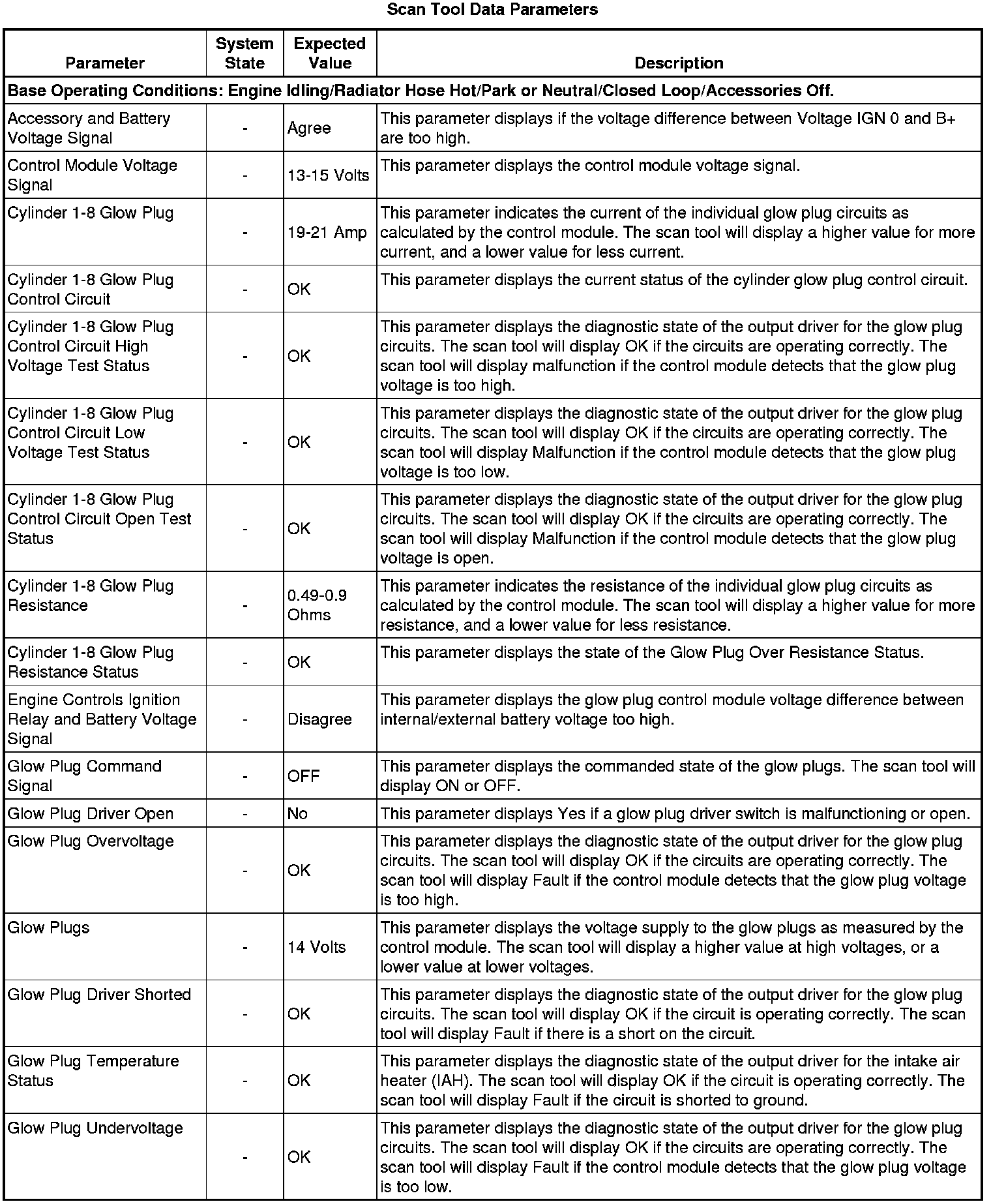 The GPCM Scan Tool Data List contains all glow plug control module related parameters that are available on the scan tool. The list is arranged in alphabetical order.