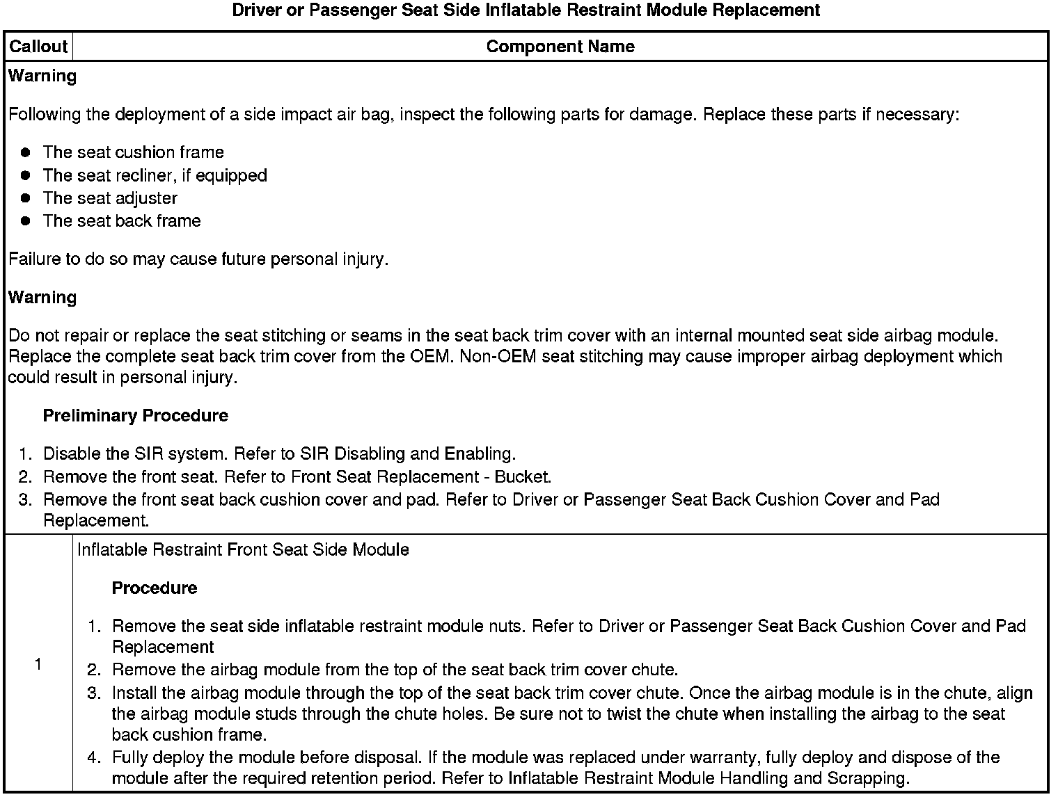 Driver or Passenger Seat Side Inflatable Restraint Module Replacement