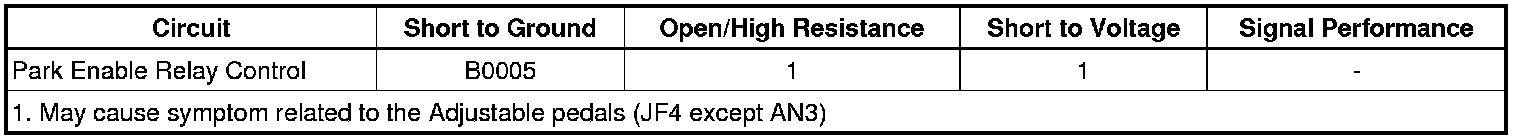 The adjustable pedals (when RPO AN3 Driver Memory Seat is not used) may only operate while the vehicle is in Park. When the body control module detects the vehicle is NOT in park it will enable the Park Enable PCB Relay by providing power to the relay control circuit. When the relay is enabled the electrical power feed to the adjustable pedals is eliminated. Once the vehicle is shifted into Park the BCM will disable the Park Enable PCB Relay and the electrical power feed to the adjustable pedals is enabled.