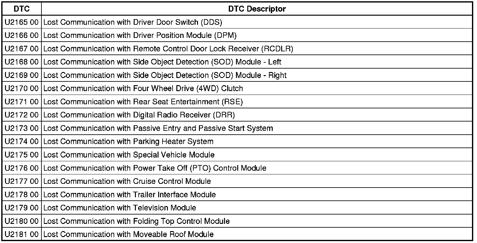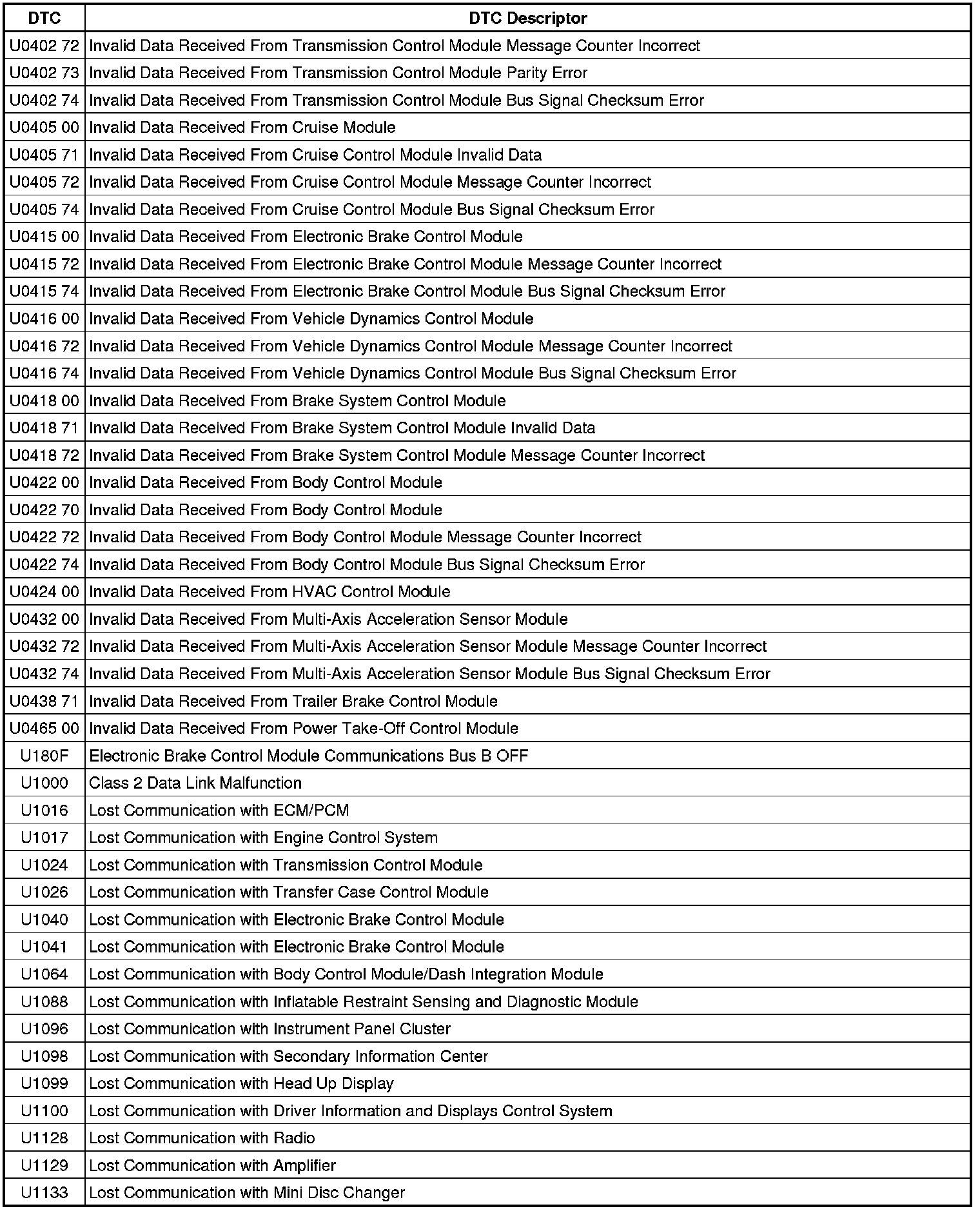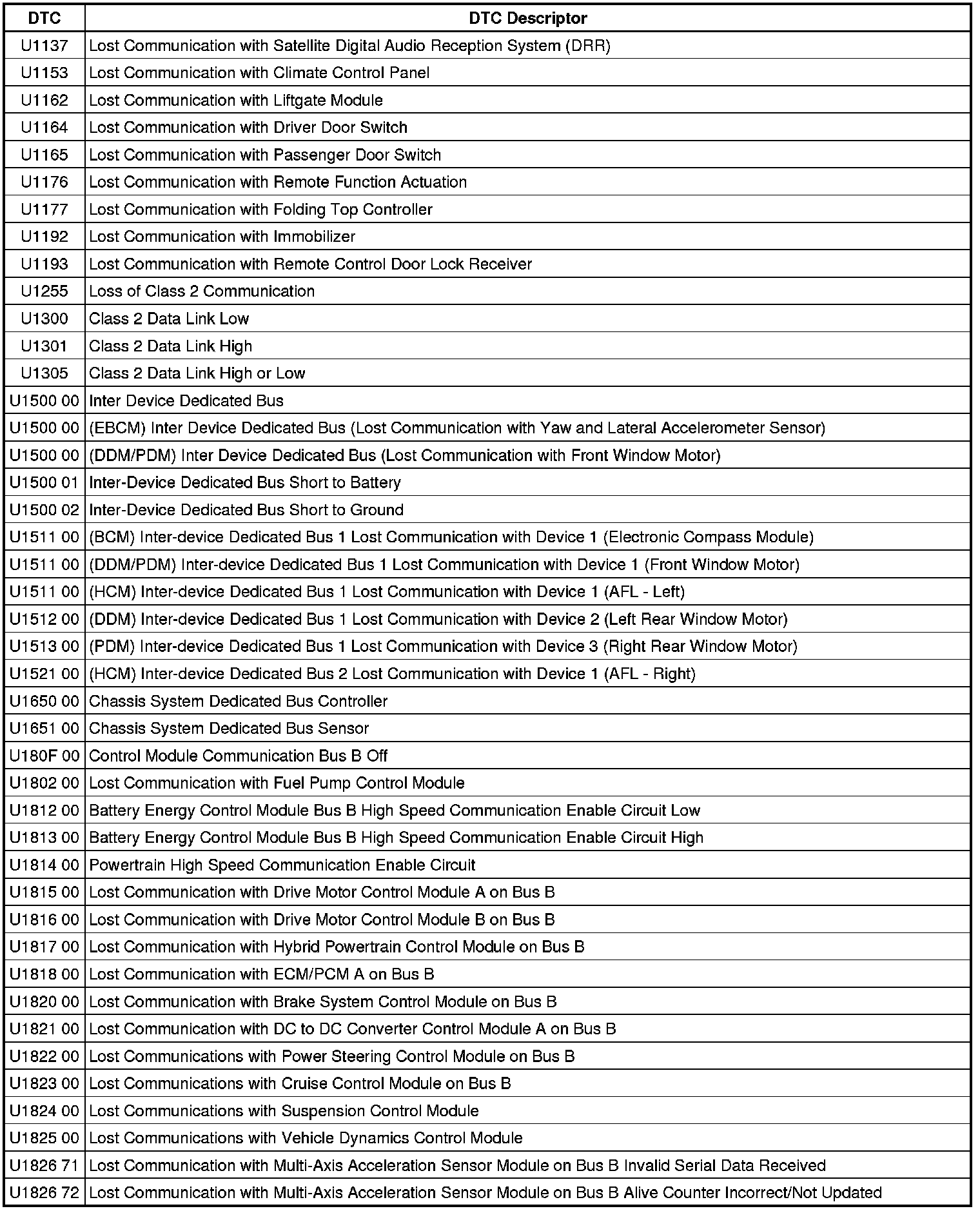 This list includes all Data Communications related U-code DTCs in alphanumeric order with descriptors for all modules. Not all DTCs listed will be applicable to all vehicles.