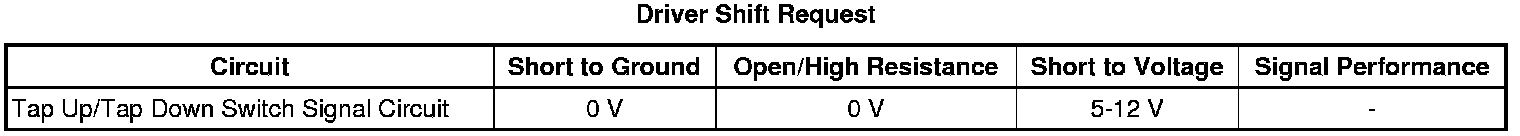 The driver shift request (DSR), also known as the TAP Up/Downshift manual shift function, allows the driver to select the desired range of gears for current driving conditions. The DSR shift system is activated when the gear selector is in the manual position. The DSR system is deactivated in all other range positions. Pressing the plus (+) switch once will command the body control module (BCM) to signal the transmission control module (TCM) to upshift to the next high gear. Pressing the minus (-) switch once will command the BCM to signal the TCM to downshift to the next lowest or previous gear. The TCM will not allow a downshift if the transmission is compromised by over-speeding. The automatic transmission manual shift switch is comprised of three different resistors values in series and two switches. The BCM supplies a 12 volt circuit to the automatic transmission manual shift switch. The signal circuit varies the voltage back to the body control module depending on which switch is depressed.