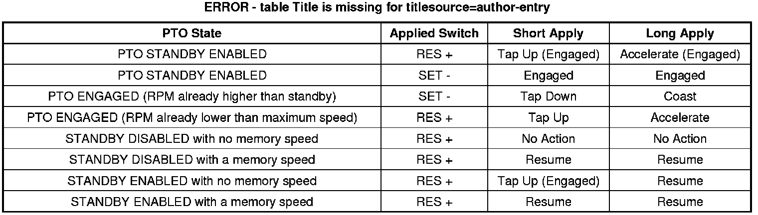 Preset PTO can only be used when the vehicle is not moving. The engine speed is initially set to a standby engine speed of 800 RPM. This provides an initial start-up engine speed to match the engagement of the PTO load. The PTO standby engine speed can be reprogrammed to higher speeds.