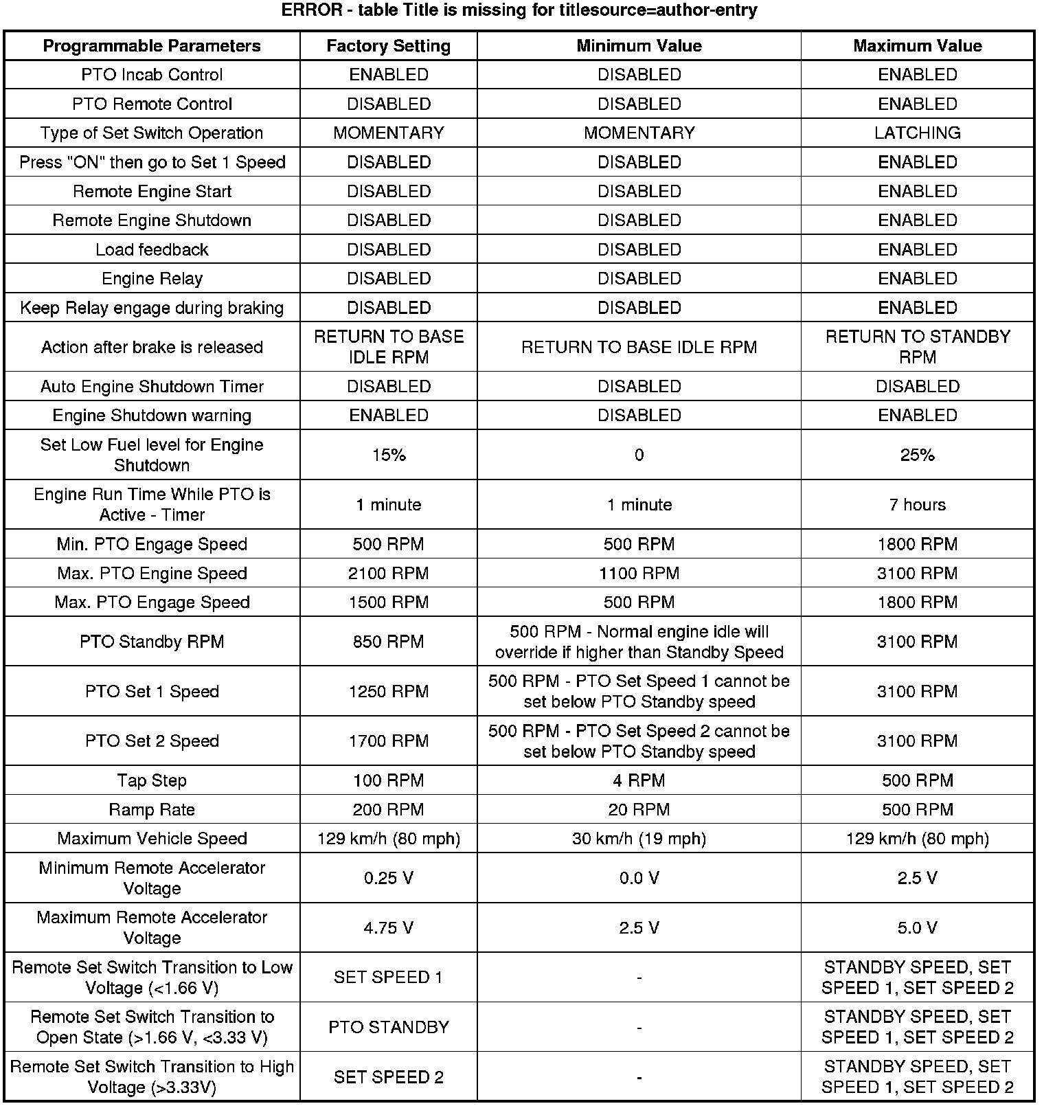 * The vehicle speed must be less than the PTO top vehicle speed limit. The default setting is 80 km/h (50 mph). This limit can be adjusted.