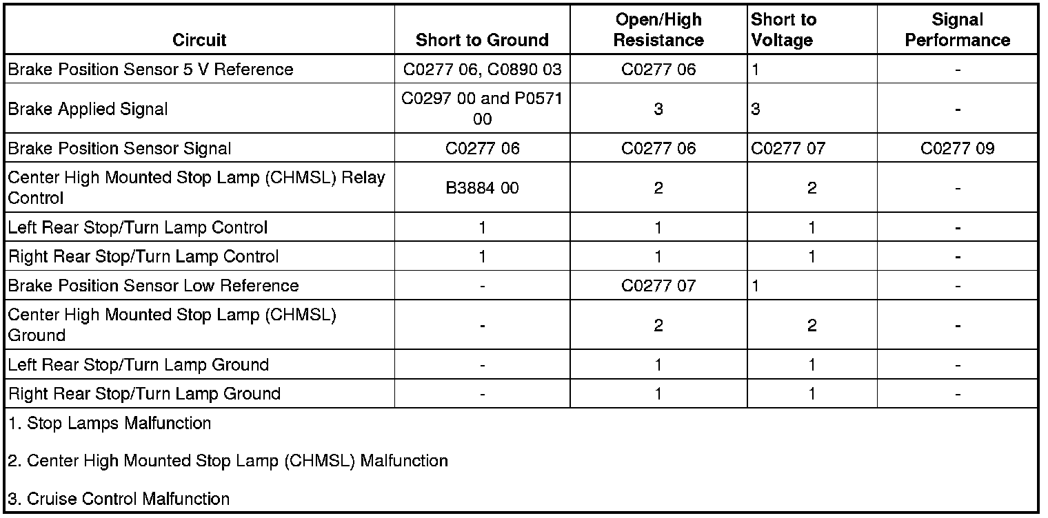 The brake pedal position sensor is used to sense the action of the driver application of the brake pedal. The brake pedal position sensor provides an analog voltage signal that will increase as the brake pedal is applied. The body control module (BCM) provides a low reference signal and a 5 V reference voltage to the brake pedal position sensor. When the variable signal reaches a voltage threshold indicating the brakes have been applied, the BCM will apply battery voltage to the right and left stop lamp control circuits, transmission control module (TCM), engine control module (ECM), and center high mounted stop lamp (CHMSL) control circuit.