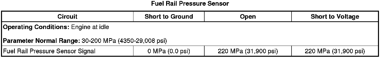 • If less than the specified range, test the Fuel Rail Pressure Sensor Signal circuit and the Fuel Rail Pressure Sensor 5 Volt Reference circuit for high resistance. If the circuit tests normal, replace the B47B fuel rail pressure sensor.