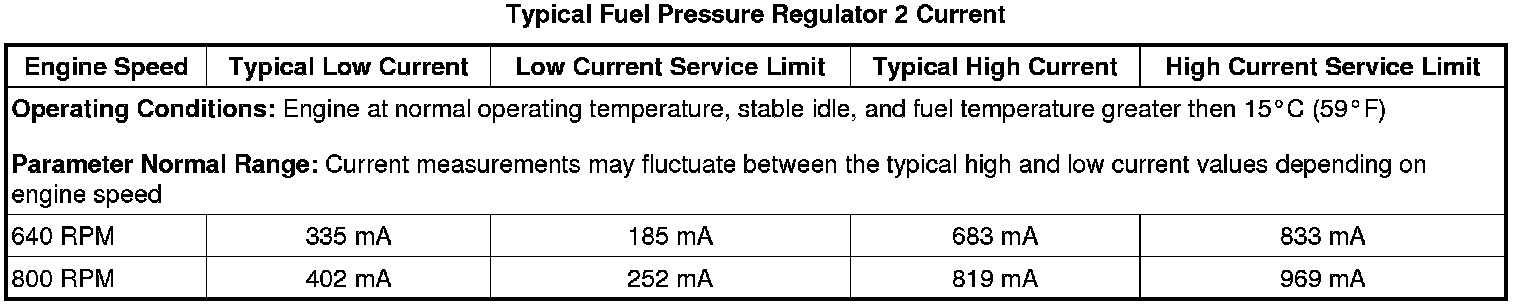 Note: Refer to Typical Fuel Pressure Regulator 2 Idle Current table for service limits in Diagnostic Aids.