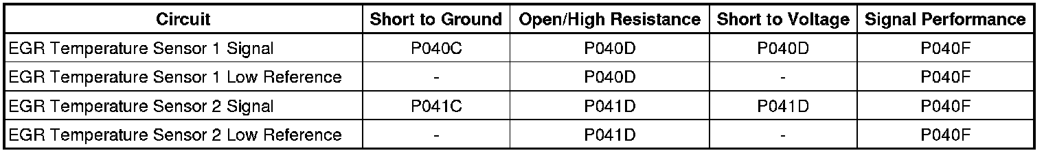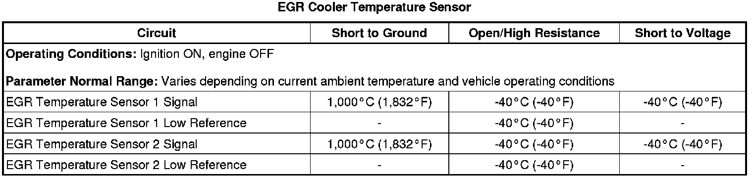 * EGR temperature sensors may fail while operating under extreme temperatures. Review the Freeze Frame/Failure Records to verify the failure criteria.