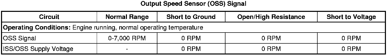 The automatic transmission (AT) input and output speed sensor (ISS and OSS) assembly each are part of a single harness. The OSS is a hall-effect type sensor. The ISS/OSS mounts to the control valve upper body assembly. The sensor end faces the output shaft housing machined slots. The sensor receives 8.3-9.3 volts on the ISS/OSS supply voltage circuit from the control solenoid valve assembly. As the output shaft rotates, the sensor produces a signal frequency based on the machined slots of the output shaft housing. This signal is transmitted through the OSS signal circuit to the control solenoid valve assembly. The control solenoid valve assembly uses the OSS signal to determine line pressure, transmission shift patterns, torque converter clutch (TCC) slip speed and gear ratio.