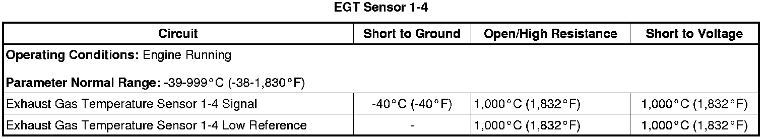 1. Ignition OFF for greater than 8 hours, observe the scan tool EGT Sensor 1-4 parameters and compare them to the ambient temperature. The readings for EGT sensors 1-4 should be within 30°C (54°F) of each other and the ambient temperature.