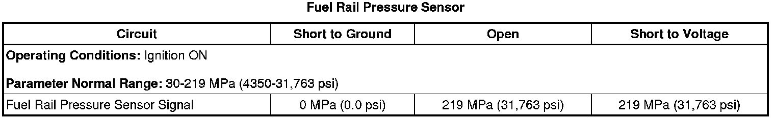 2. Observe the Fuel Rail Pressure Sensor parameter with a scan tool. During engine cranking, the pressure should be at least 10 MPa (1450 psi). With the engine running at idle, the pressure should be close to the Desired Fuel Rail Pressure. As the engine speed increases, the Desired Fuel Rail Pressure and the Actual Fuel Rail Pressure should closely match each other.
