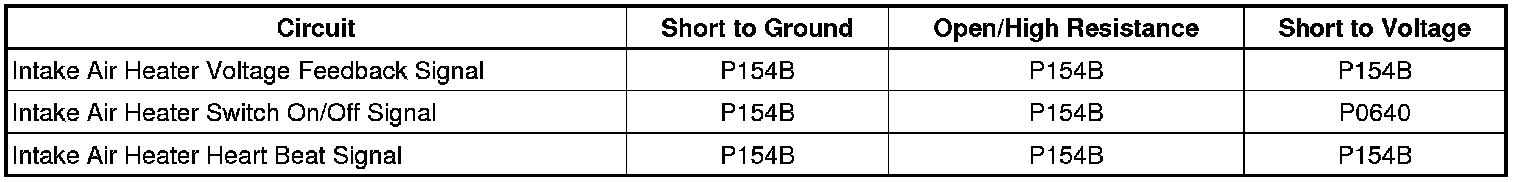 * Intake air heater signal voltage is greater than 1.5 V after the intake air heater has been commanded OFF for more than 65 ms.