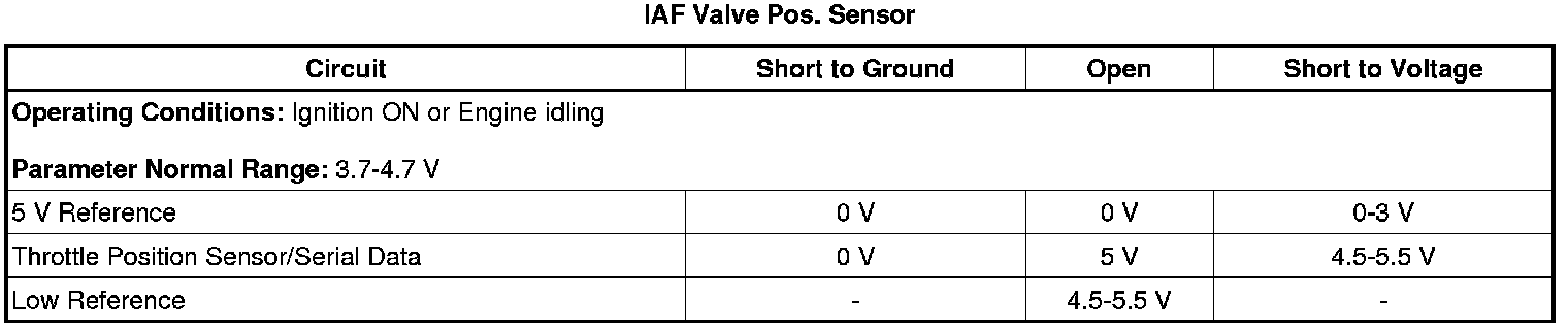 2. Engine idling, observe the scan tool IAF Valve Pos. Sensor voltage parameter. The reading should be between 3.7-4.7 V.
