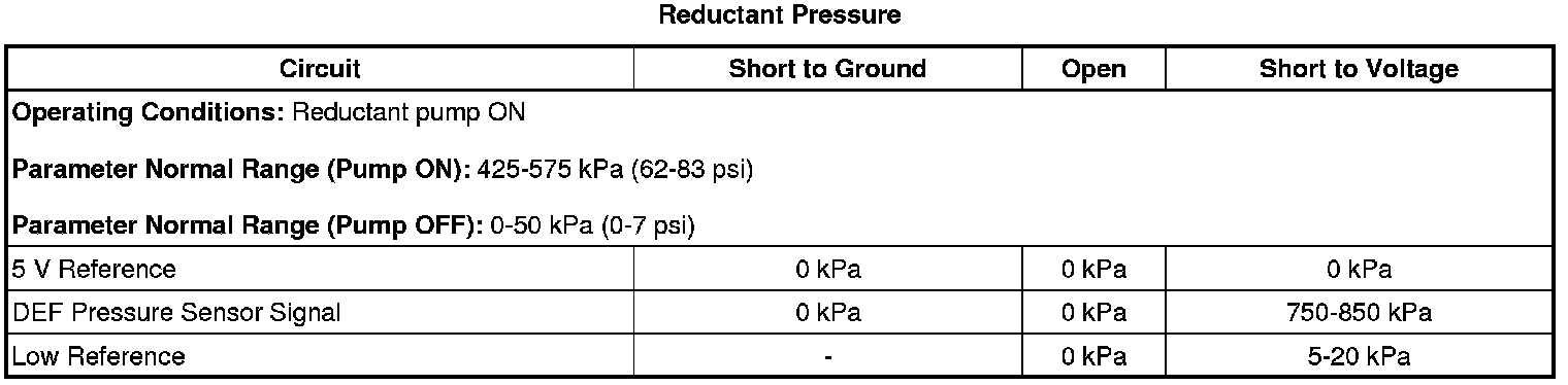 * The reductant pump module pressure is greater than 650 kPa (94 psi) for more than 10 s or greater than 795 kPa (115 psi) for more than 1 s.