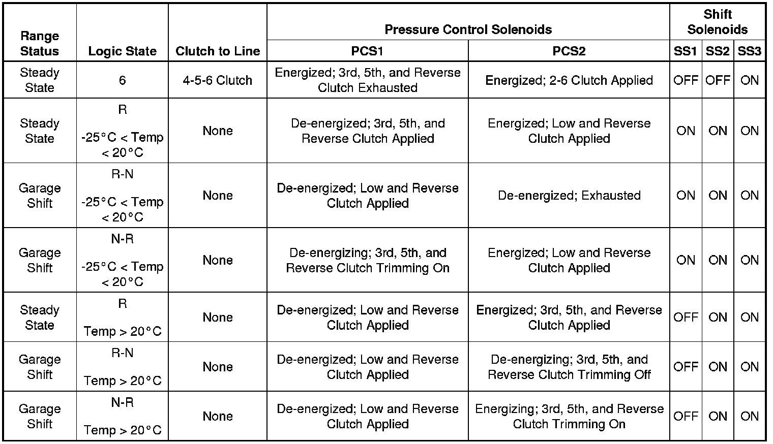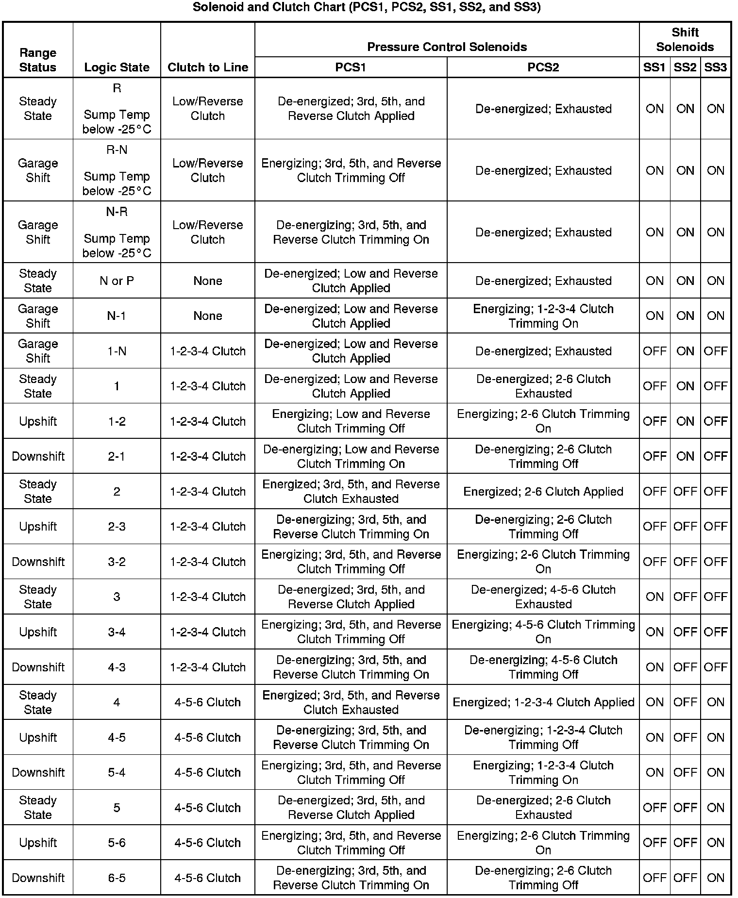 Solenoid and Clutch Chart (PCS1, PCS2, SS1, SS2, and SS3)