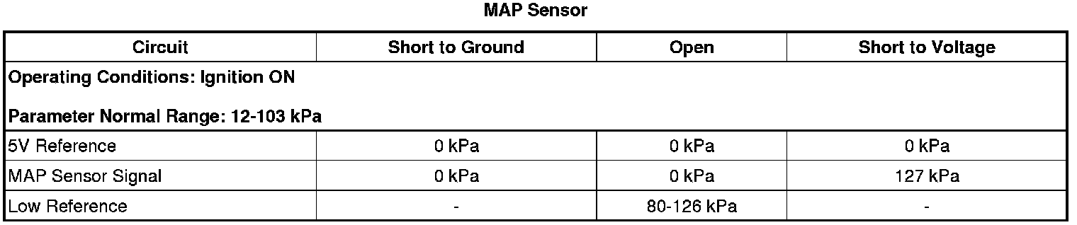 Under normal operation the highest pressure that can exist in the intake manifold is equal to BARO. This occurs when the vehicle is operated at wide-open throttle (WOT) or when the ignition is on while the engine is off. Under these conditions, the ECM uses the MAP sensor to determine the current BARO. The lowest manifold pressures occur when the vehicle is idling or decelerating. MAP can range from 10 kPa, when pressures are low, to as much as 104 kPa when pressures are high, depending on the BARO. The ECM monitors the MAP sensor signal for pressure outside of the normal range.