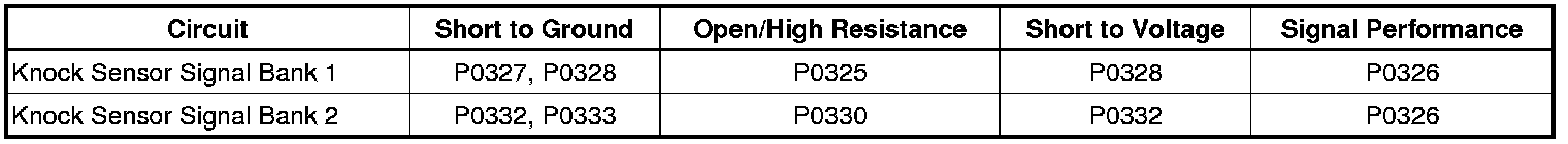 The knock sensor (KS) system enables the engine control module (ECM) to control the ignition timing for the best possible performance while protecting the engine from potentially damaging levels of detonation. The ECM monitors 2 separate KS, one on each side of the engine block. Each KS produces an AC voltage that varies, depending on the vibration levels detected during engine operation. The ECM receives the KS signal through 2 isolated signal circuits for each KS. The ECM adjusts the spark timing based on the amplitude and frequency of each KS signal. The ECM learns a minimum noise level for each sensor at idle speeds, and uses calibrated noise level values for the rest of the RPM range. The ECM should monitor a normal KS signal within the noise channel.