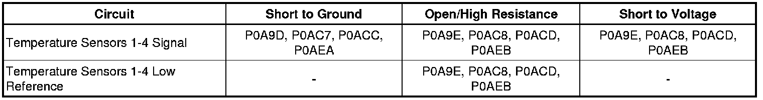 * Test the resistance across each temperature sensor 5 V reference and low reference circuits. Refer to Temperature Versus Resistance Temperature Versus Resistance.
