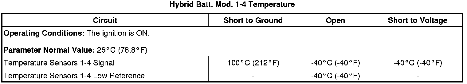 2. Ignition ON, observe the scan tool BECM hybrid battery temperature parameters. The readings should be between -39 and +95°C (-38.2 and +203°F) with no greater than a 15°C (59°F) difference between any of the four temperature sensor readings. Refer to Temperature Versus Resistance Temperature Versus Resistance.
