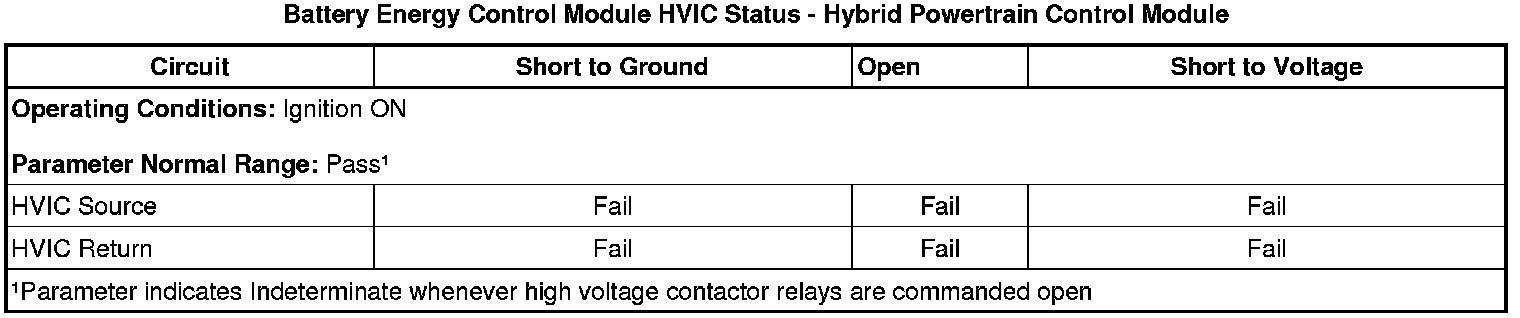 If the DTC set, Record and then clear the DTC information. Ignition OFF, wait 2 minutes. Ignition ON, observe the scan tool HPCMs battery energy control module HVIC Status and hybrid powertrain control module HVIC Status parameters. The parameters should both indicate a PASS condition.