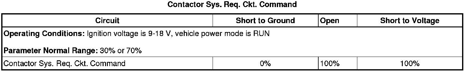 * The drive motor generator battery control module will set Contactor System Status parameter to OPEN when the Contactor System Request Circuit Command parameter percent duty cycle is 65-75 percent.