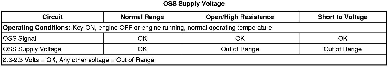 The output speed sensor (OSS) assembly has 2 internal hall-effect type sensors, and is capable of sensing both speed and direction. The OSS mounts to the A/T rear case assembly and is connected to the control solenoid (w/body and TCM) valve assembly through a wire harness and connector. The sensor faces the hybrid direct, 2-3-4 clutch housing assembly machined teeth surface. The sensor receives 8.3-9.3 volts on the OSS supply voltage circuit from the transmission control module (TCM). As the output shaft rotates, the sensor produces a signal frequency based on the machined surface of the output shaft.