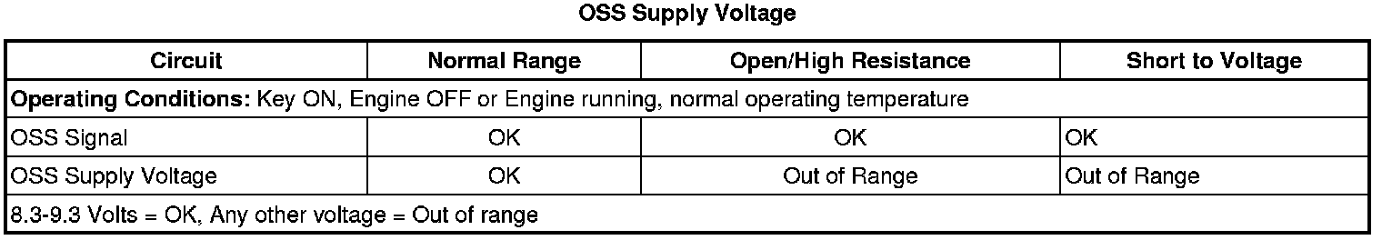 The output speed sensor assembly has 2 internal hall-effect type sensors, and is capable of sensing both speed and direction. The output speed sensor assembly mounts to the A/T rear case assembly and is connected to the control solenoid valve assembly through a wire harness and connector. The sensor faces the hybrid direct, 2-3-4 clutch housing assembly machined teeth surface. The sensor receives 8.3-9.3 volts on the OSS supply voltage circuit from the transmission control module (TCM). As the output shaft rotates, the sensor produces a signal frequency based on the machined surface of the output shaft.