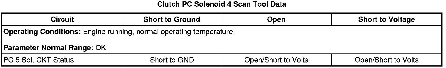 3. Engine ON, observe the scan tool Clutch PC 5 Sol. CKT Status parameter. The reading should display OK or Indeterminate.