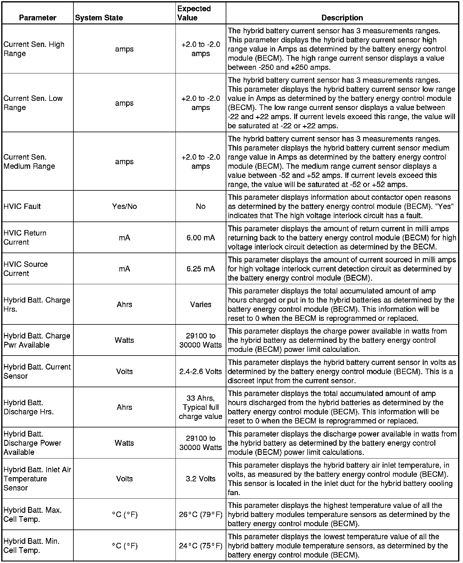 If all values are within the expected range described below, refer to Symptoms - Hybrid Energy Storage Symptom Related Diagnostic Procedures for diagnosis.