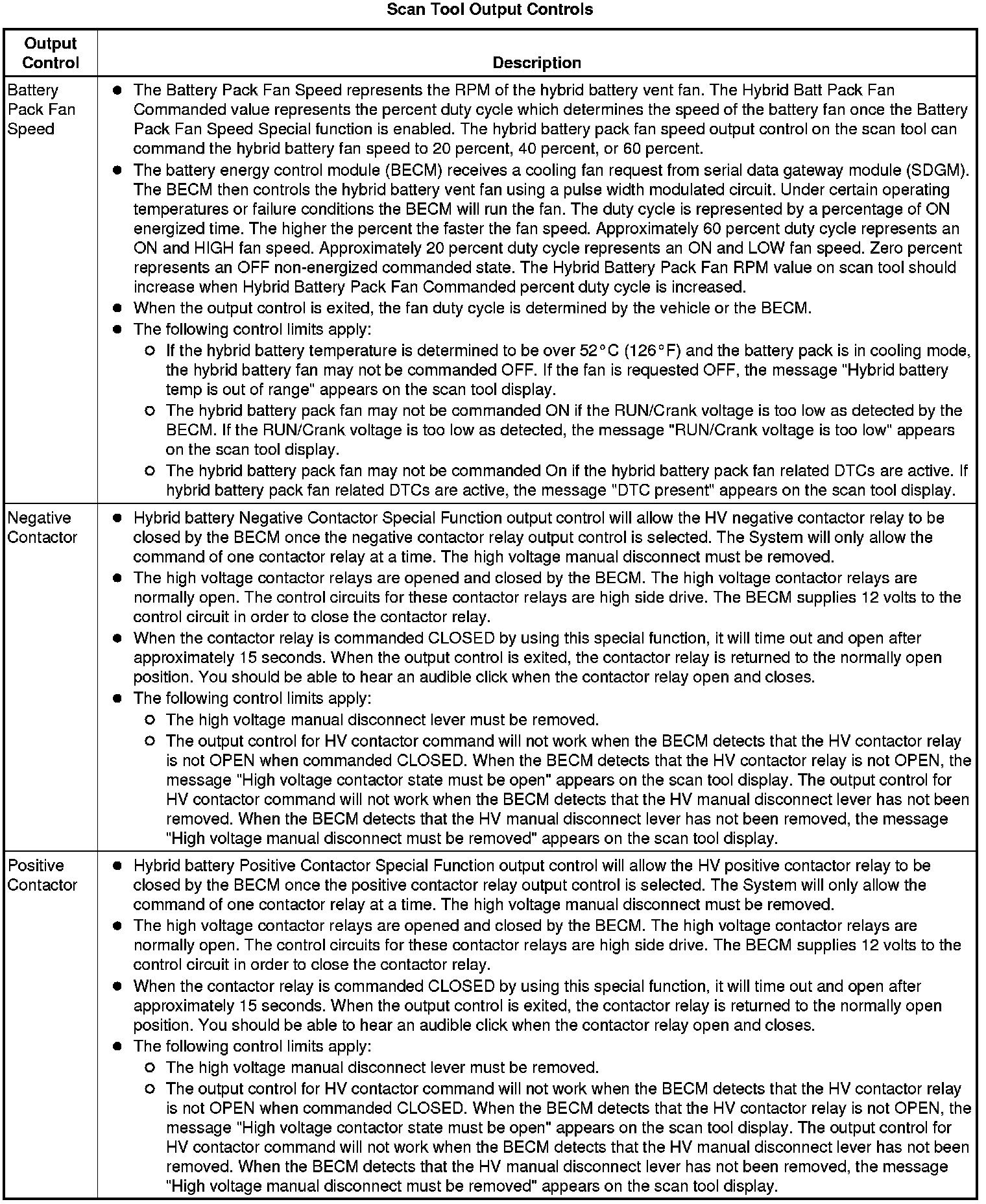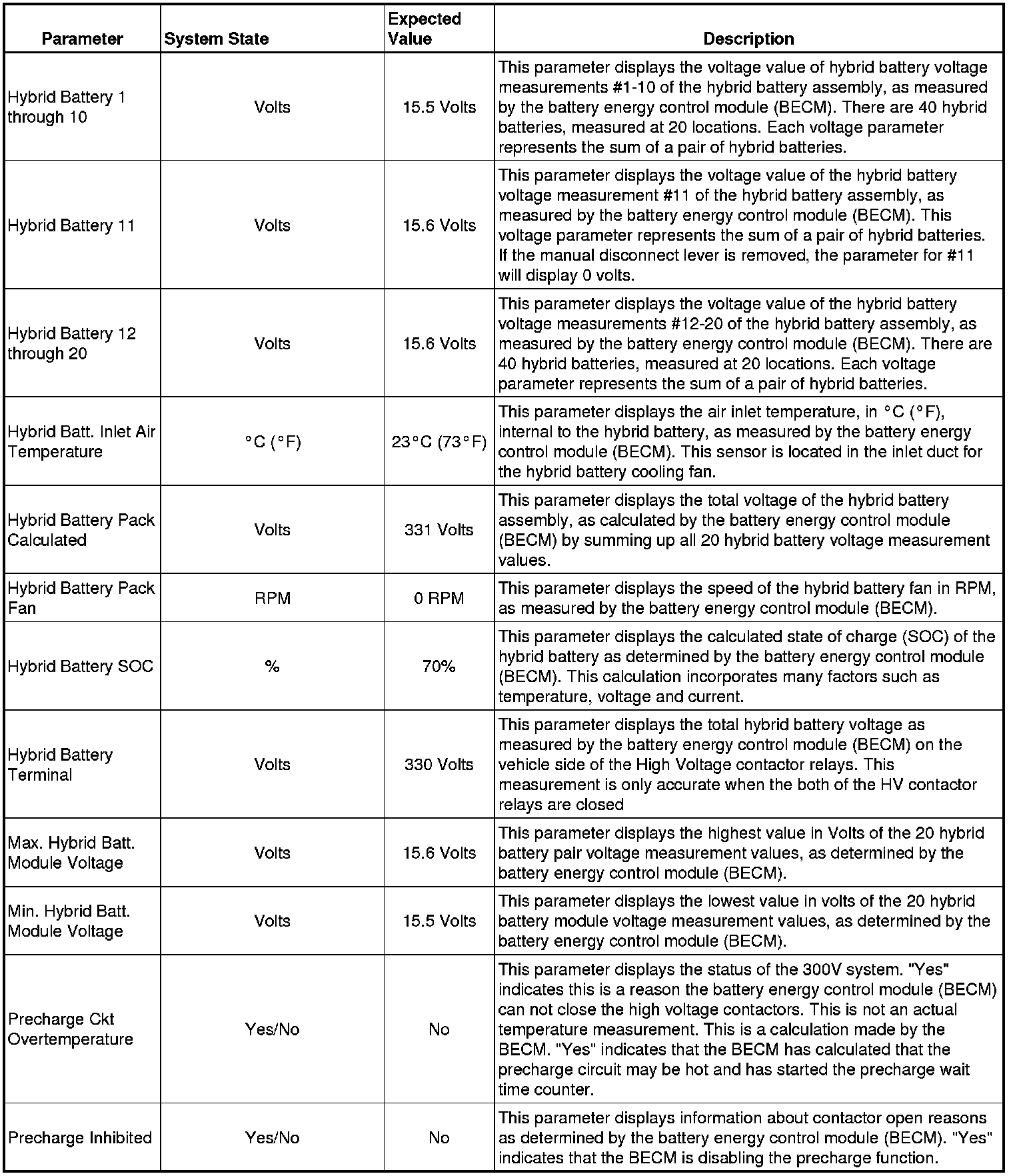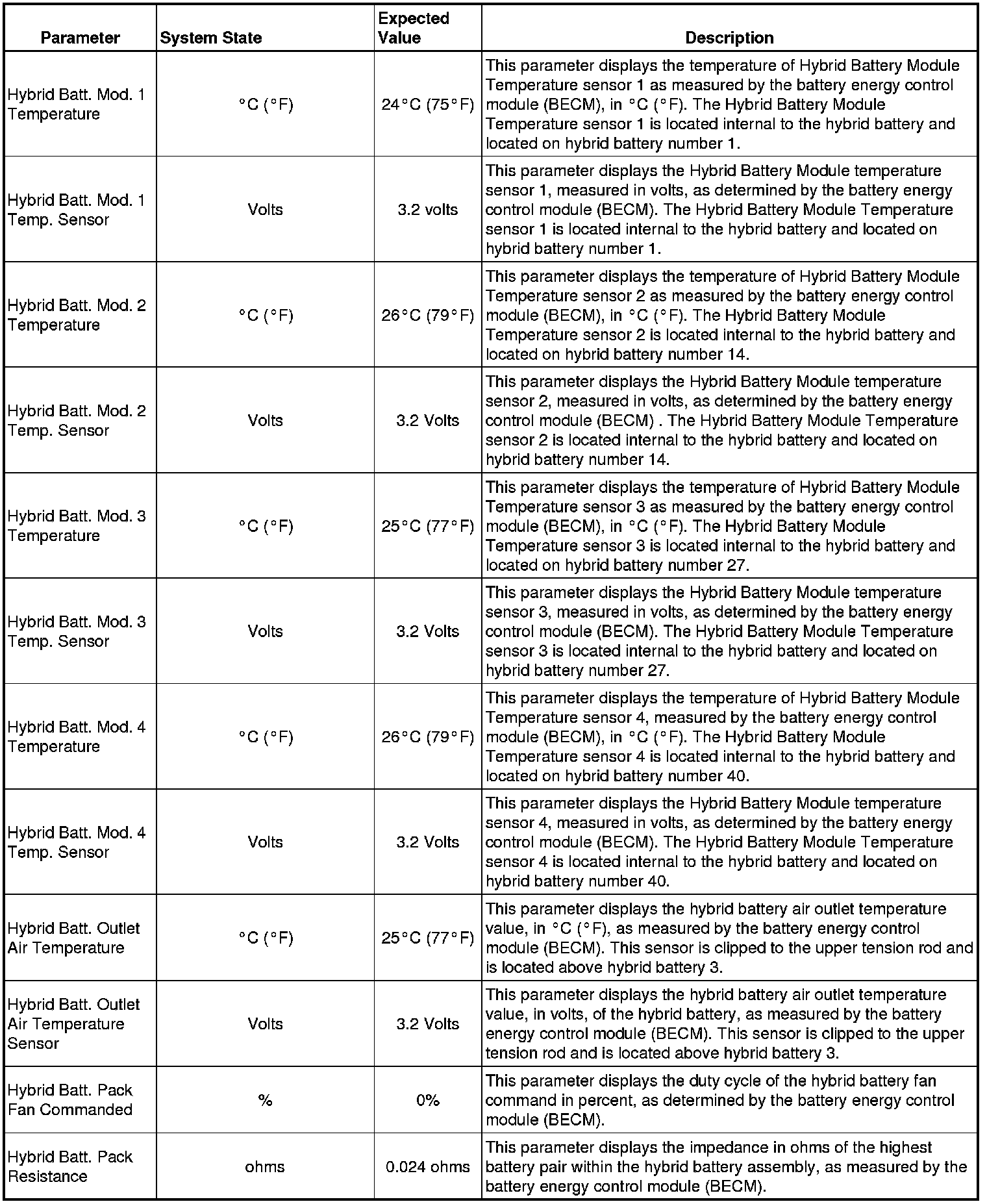 The Drive Motor Generator Battery Control Module Scan Tool Data List contains all Hybrid Battery related parameters that are available on the scan tool. The list is arranged in alphabetical order. A given parameter may appear in any one of the data lists, and in some cases may appear more than once, or in more than one data list in order to group certain related parameters together.