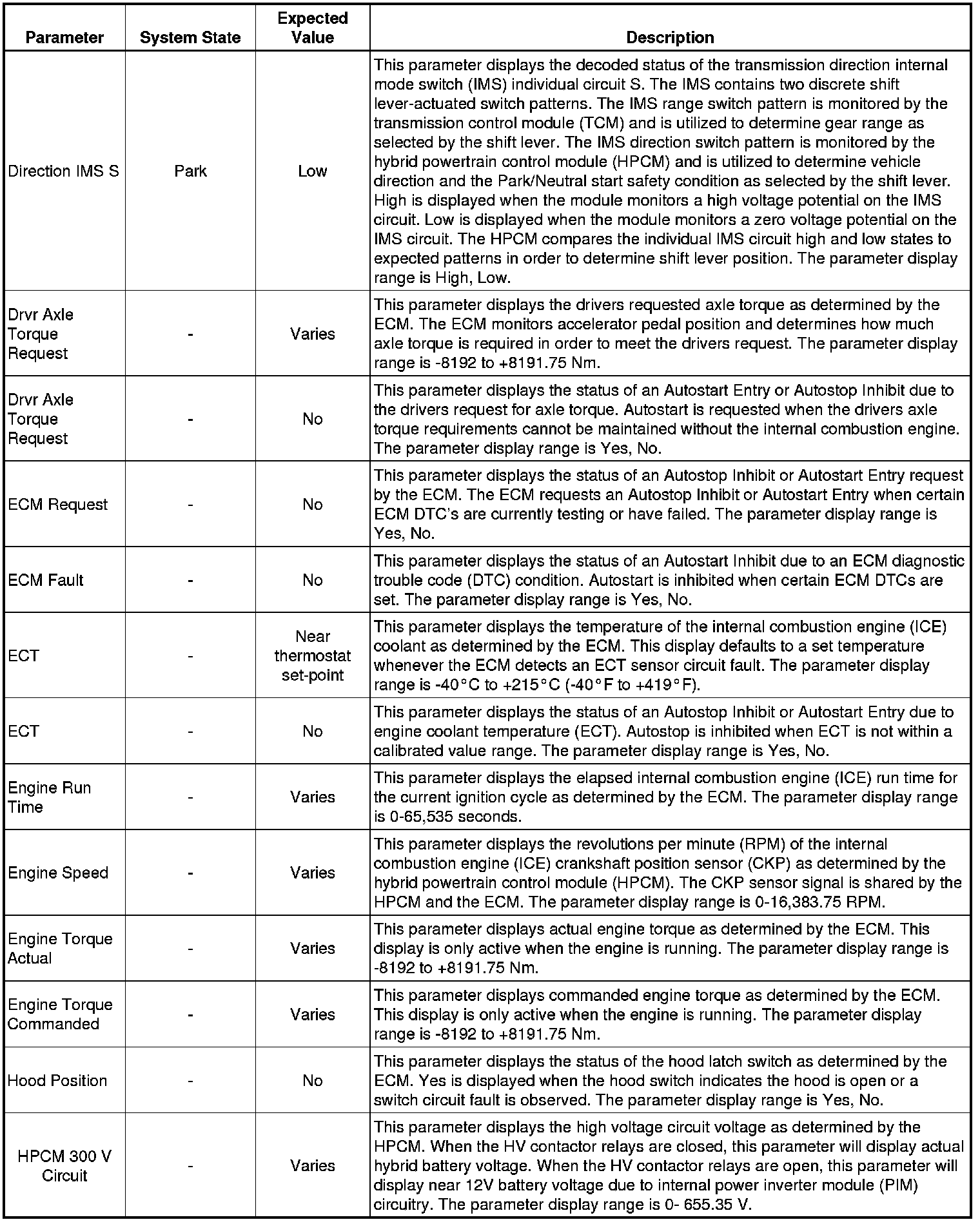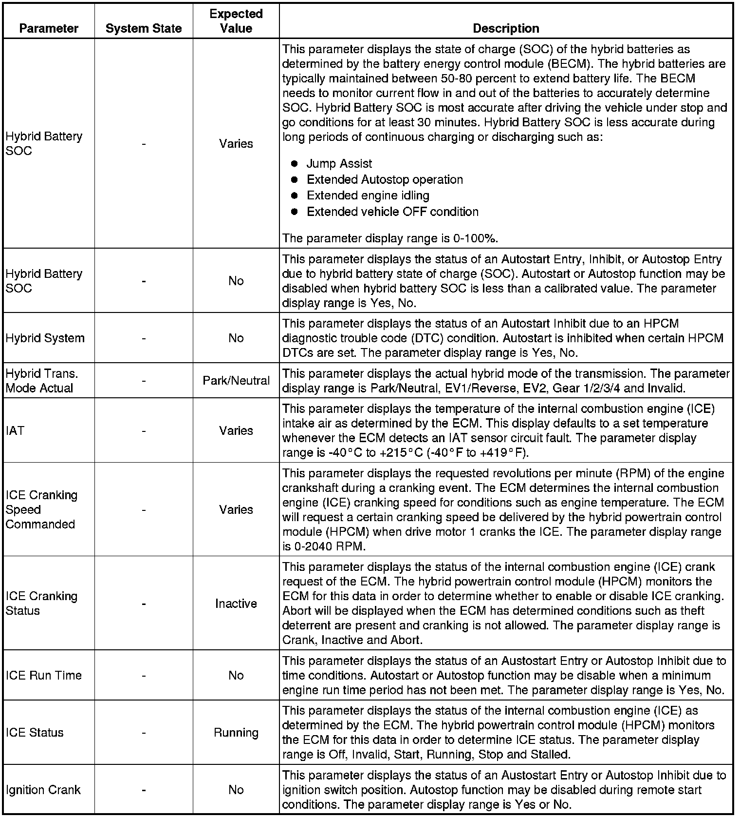 The scan tool values from a properly running vehicle may be used for comparison with the vehicle you are diagnosing. The Hybrid Powertrain Control Module Scan Tool Data Parameters list represents values that would be seen on a normally running vehicle.