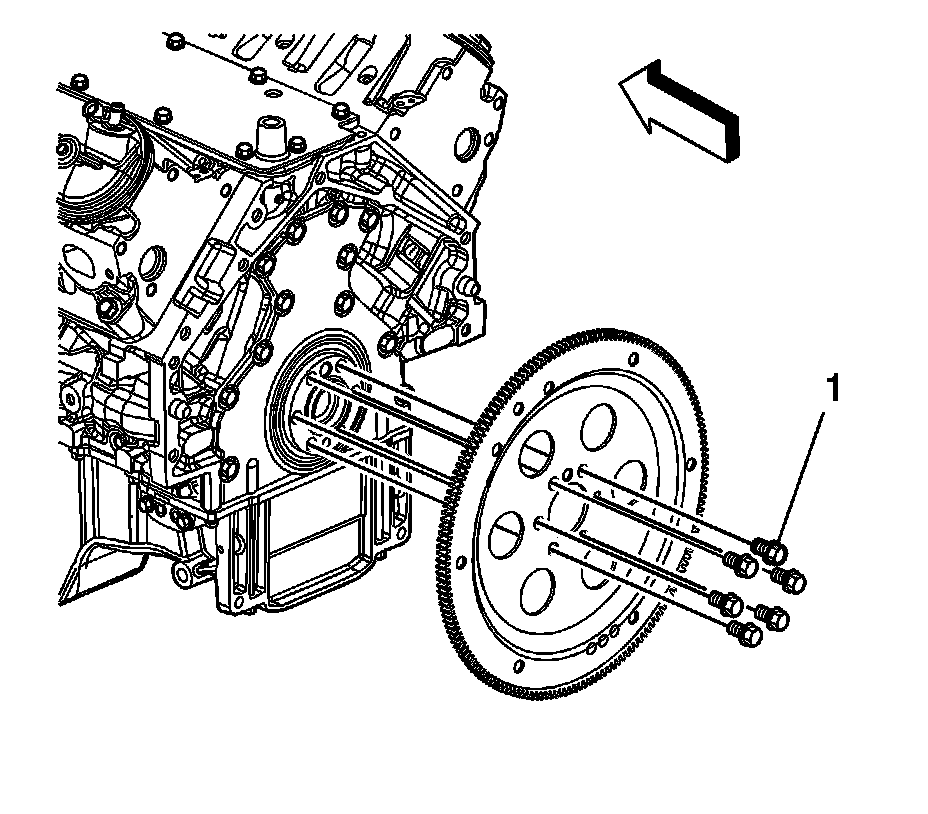 1. Install the flywheel and bolts (1) to the crankshaft.