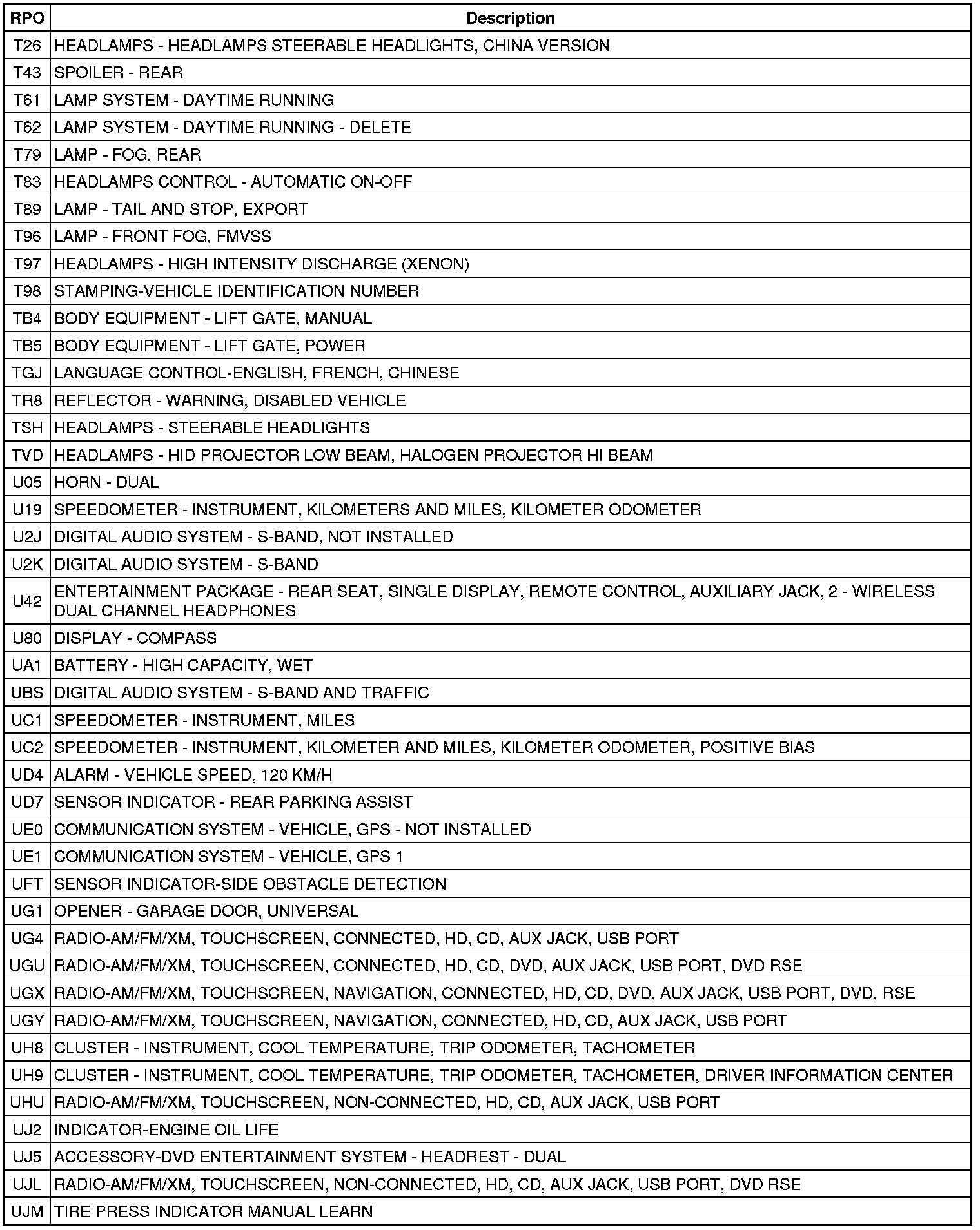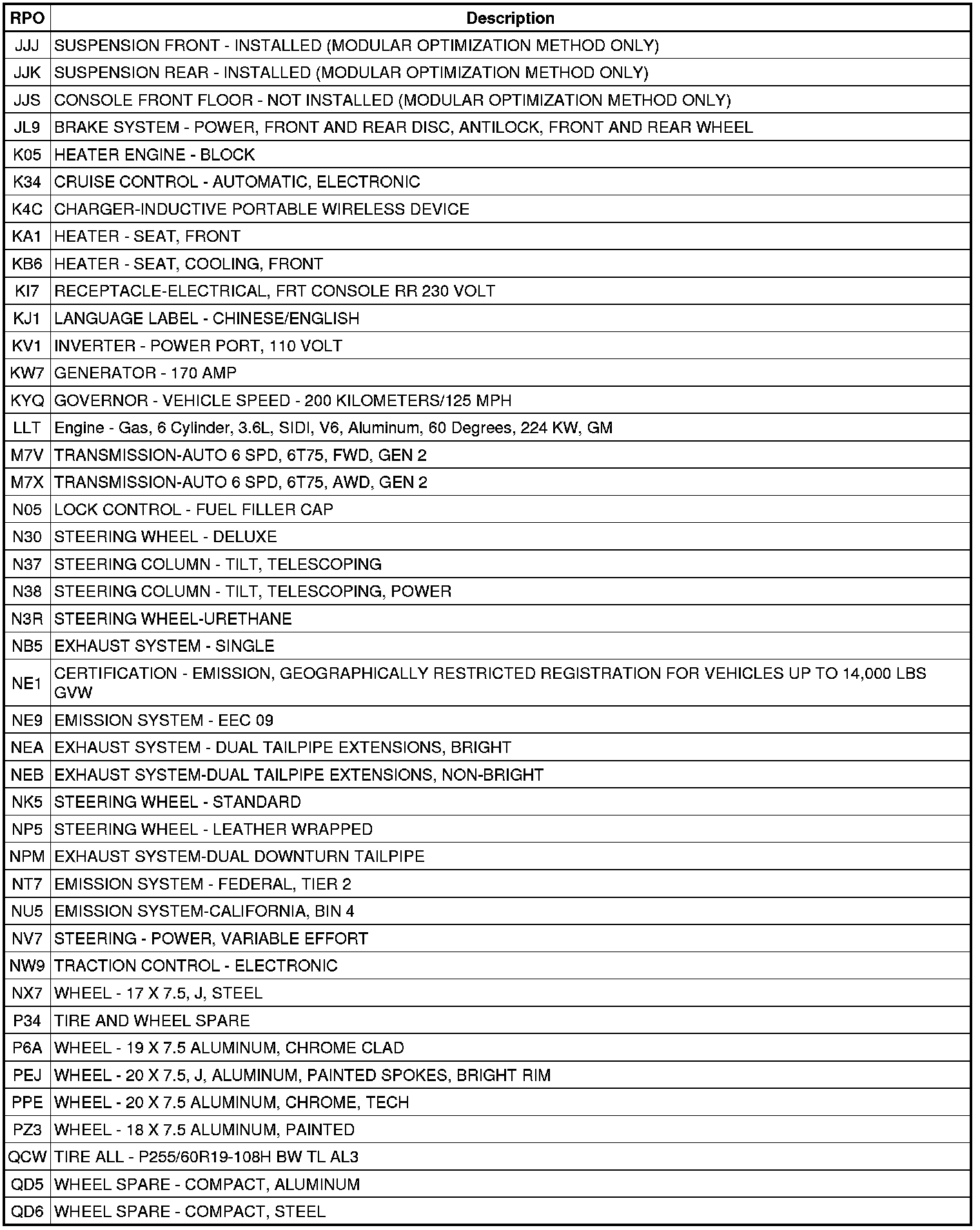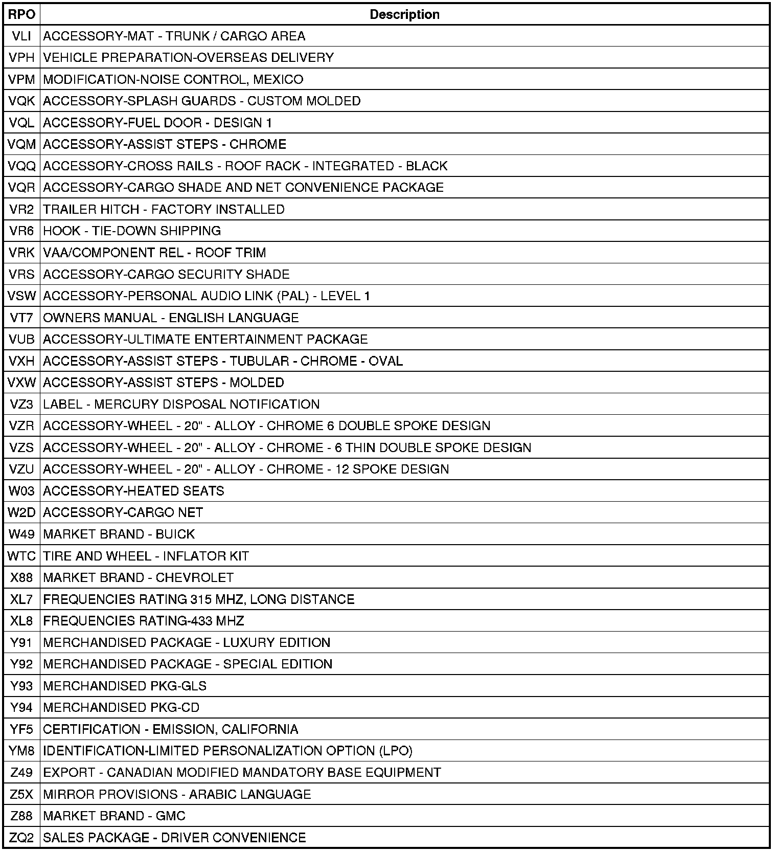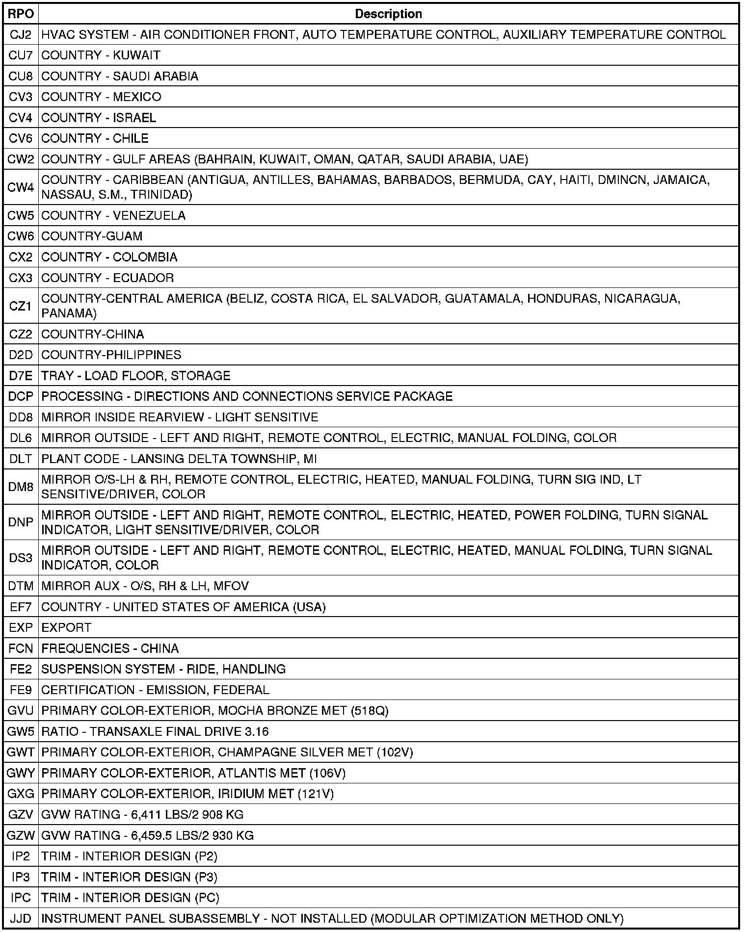 The following table provides the description of the RPO codes that are available on the vehicle. The vehicles RPO list is printed on the Service Parts Identification Label.