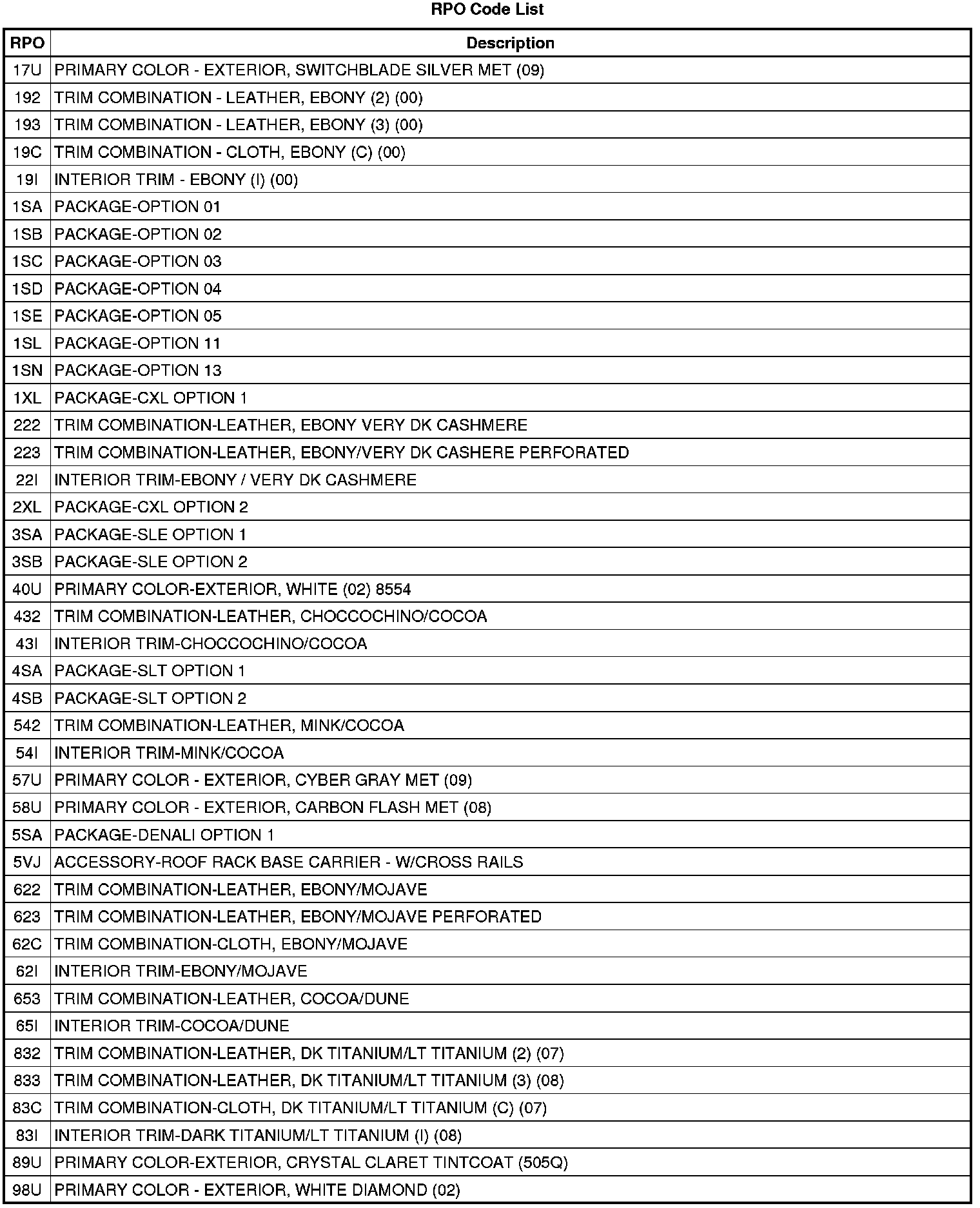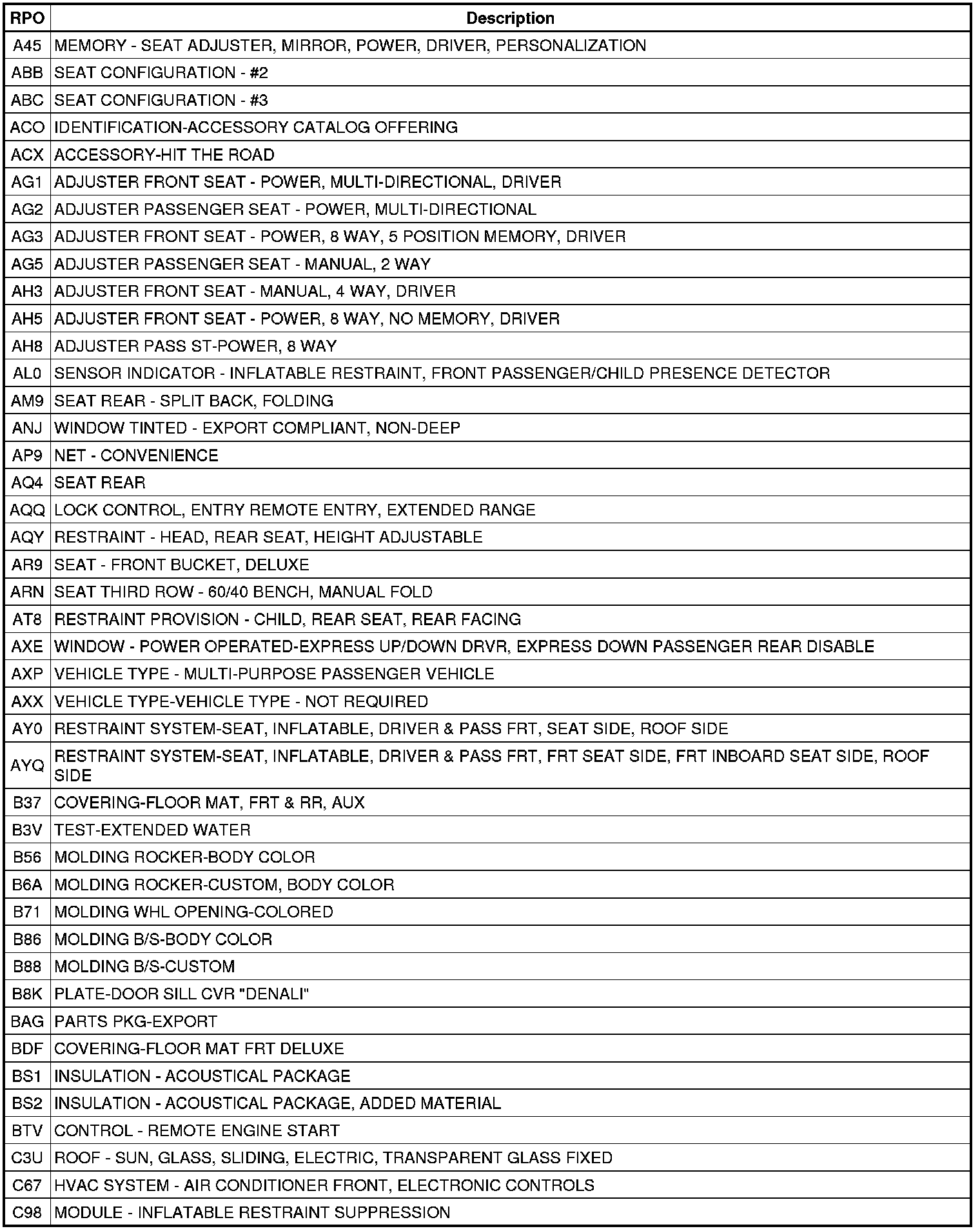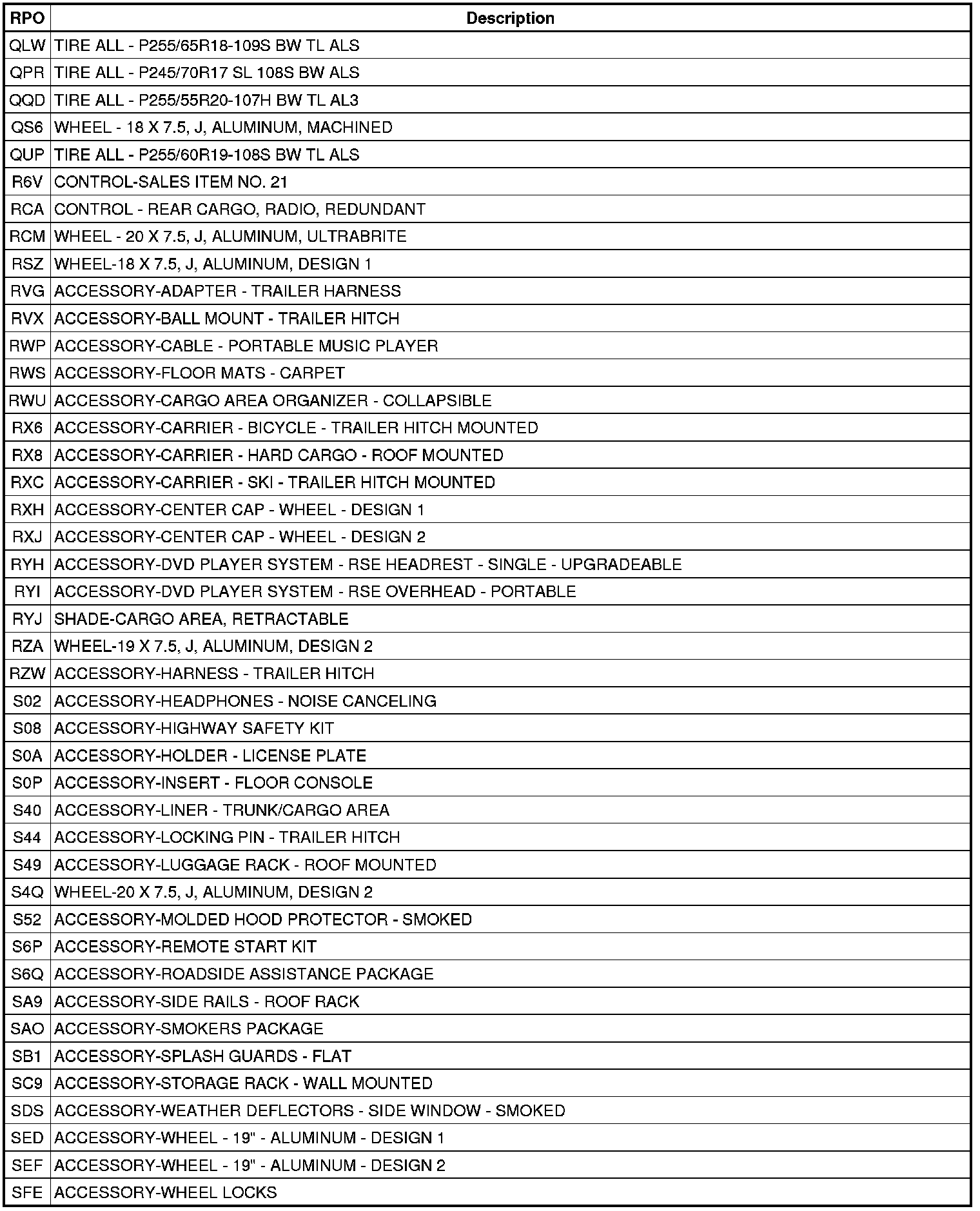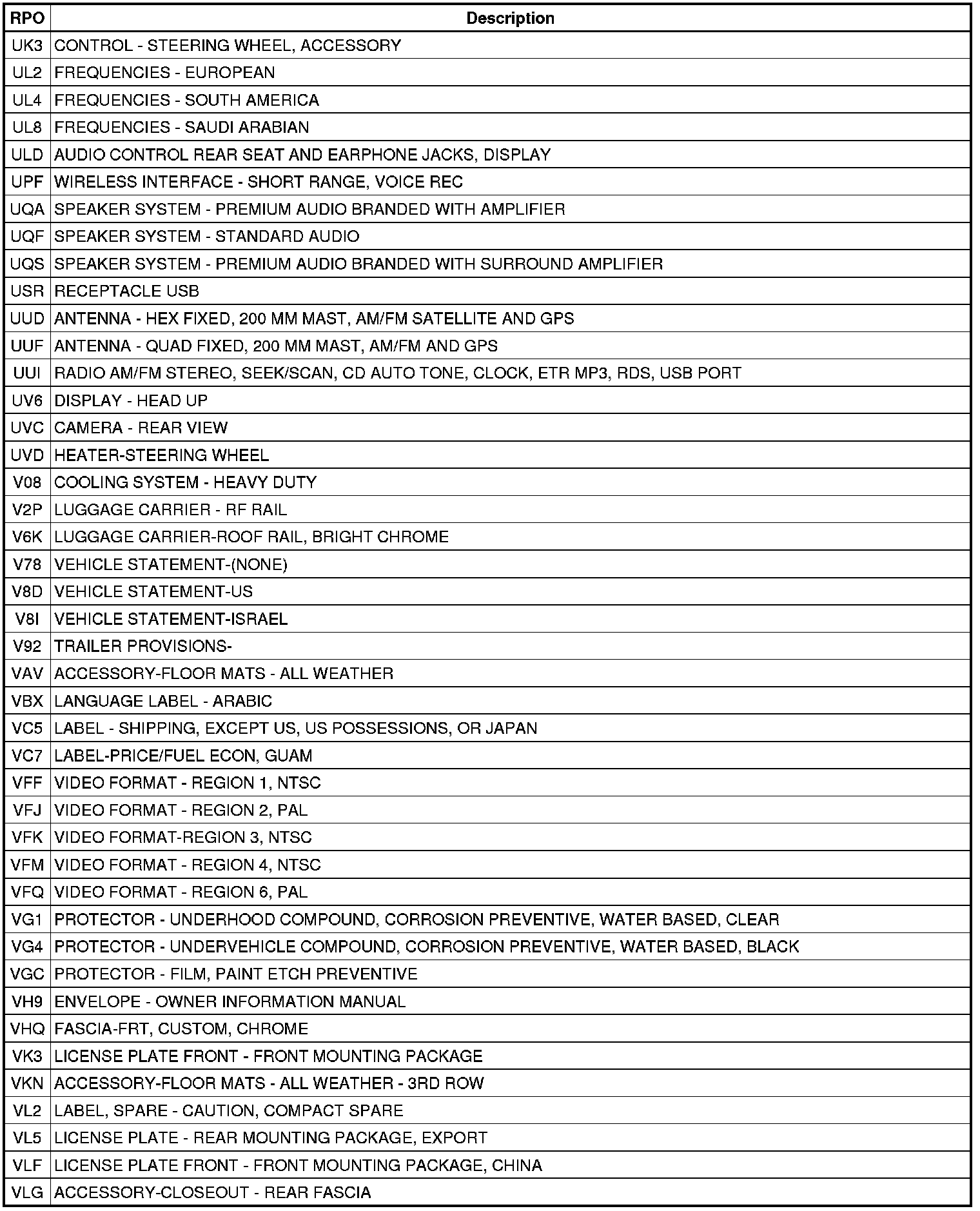 The following table provides the description of the RPO codes that are available on the vehicle. The vehicles RPO list is printed on the Service Parts Identification Label.