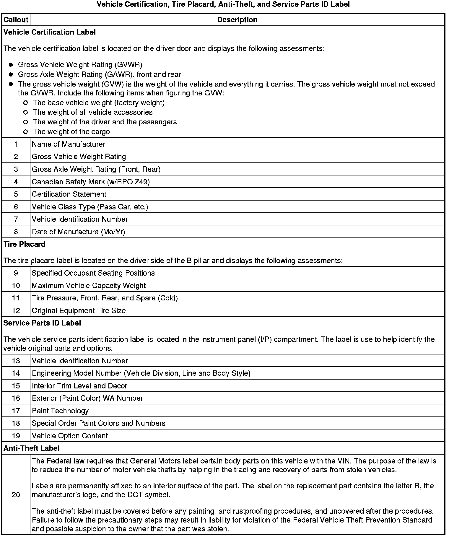 Vehicle Certification, Tire Placard, Anti-Theft, and Service Parts ID Label