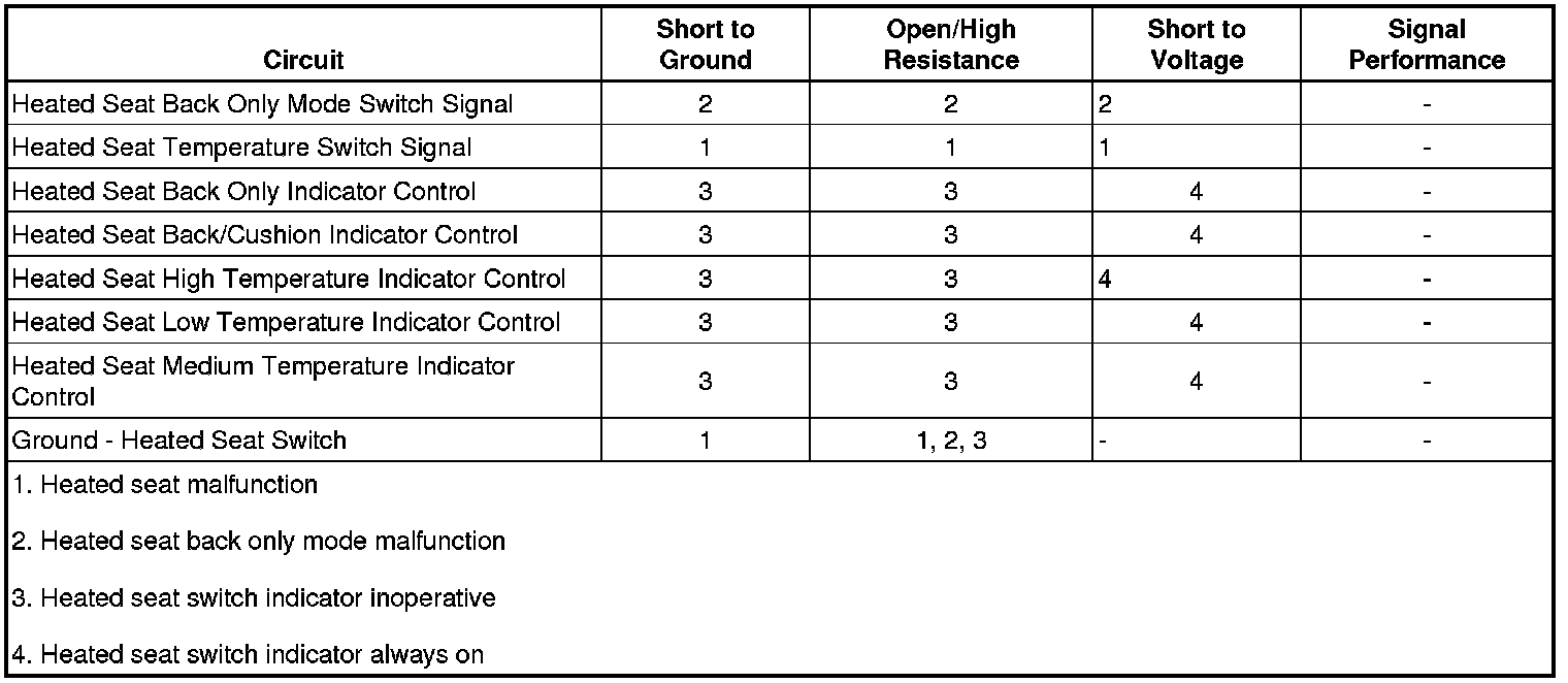 2. If all heated seat switch functions operate OK, but, one or more of the heated seat switch indicators is inoperative or is always ON, refer to Heated Seat Switch Indicator Malfunction.