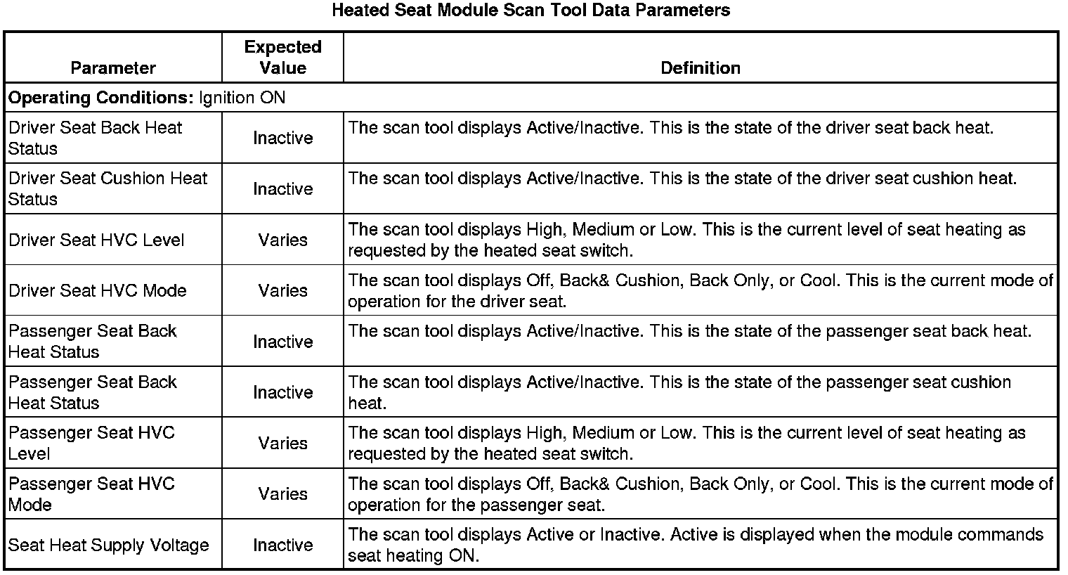 Driver Seat and Passenger Seat Heater Control Module Scan Tool Information