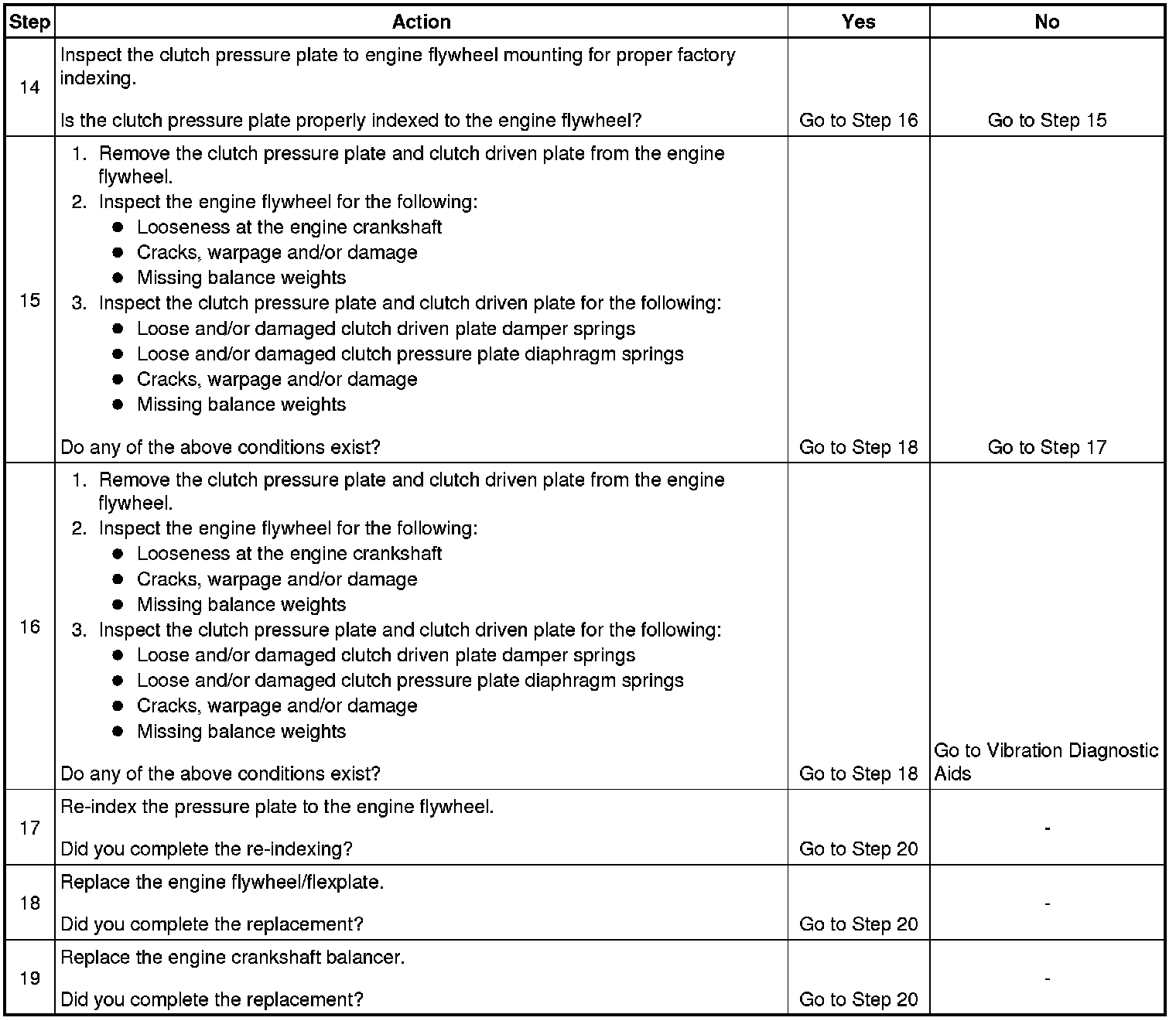 17. Re-indexing the pressure plate to the engine flywheel alters the balance relationship between the pressure plate/flywheel assembly and the rear of the engine.